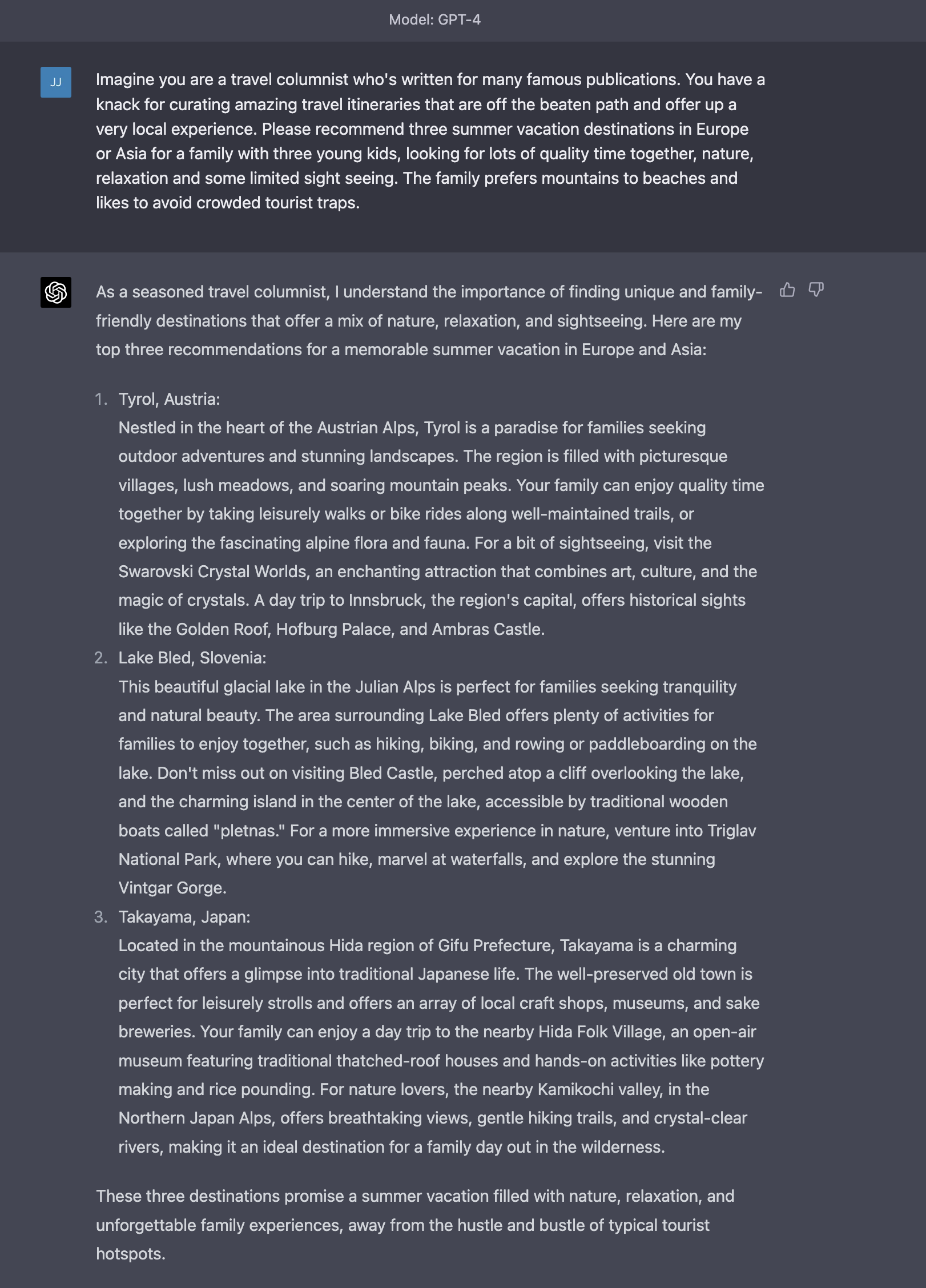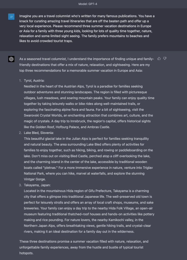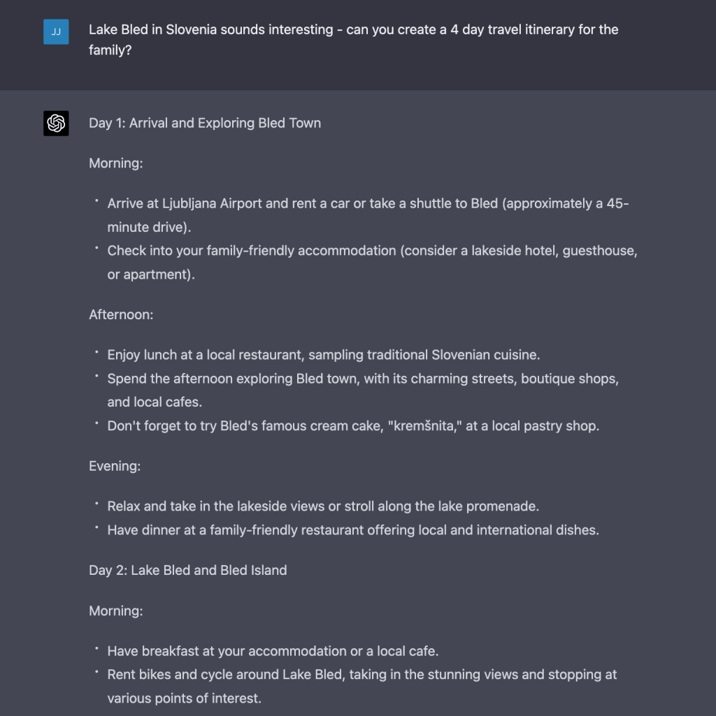 Let’s try a little test of our own, using ChatGPT – I asked it for some very specific destination inspiration to begin with and true to form, it delivered some pretty intriguing recommendations:
