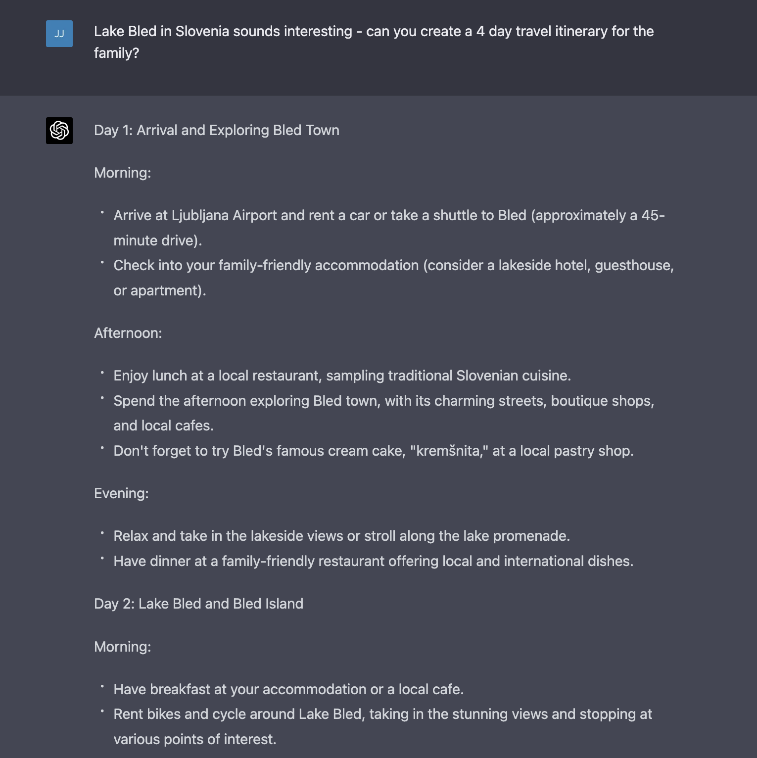 Next, I asked ChatGPT for a proper day-by-day itinerary (truncated below):