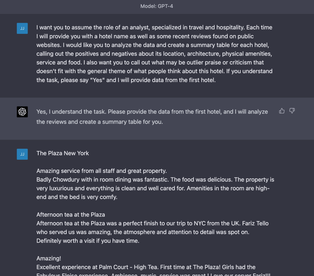 Let’s take on today’s challenge: to use the power of AI to analyze heaps of data and uncover the heart of the matter. To test this, I had ChatGPT act as a hotel review analyst. I fed it plain text reviews from public forums and asked it to summarize the key insights.