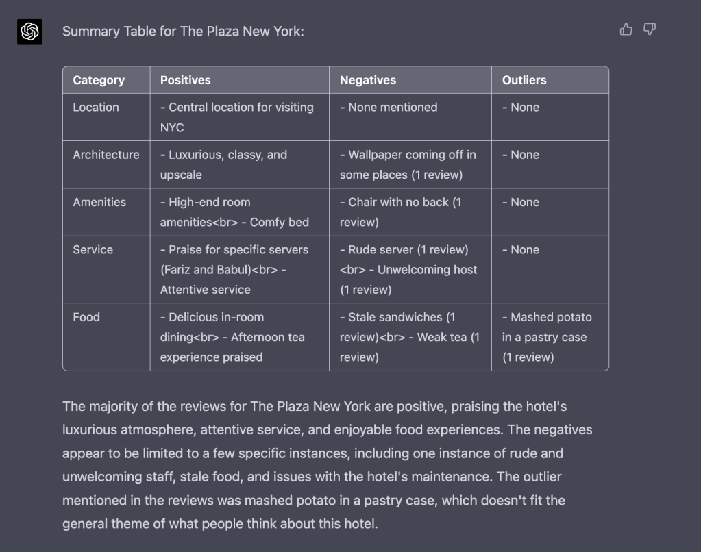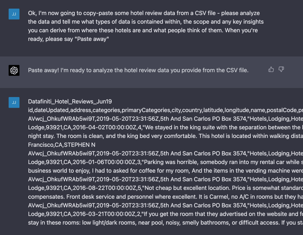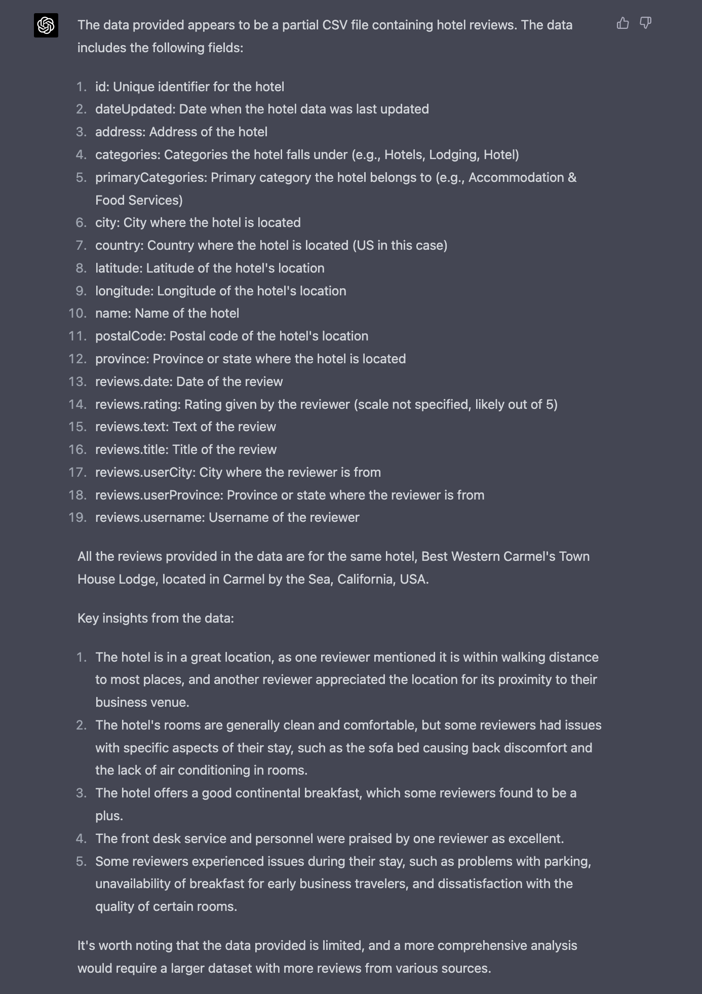 I also wanted to push the AI to its limits and see how it handled (for want of a better term), essentially a structured data dump. To test this, I grabbed a small portion of publicly available hotel review datasets (source), removed a few columns, and handed it over to ChatGPT. I asked it to dive into the data and see what it could uncover – any insights it could provide.