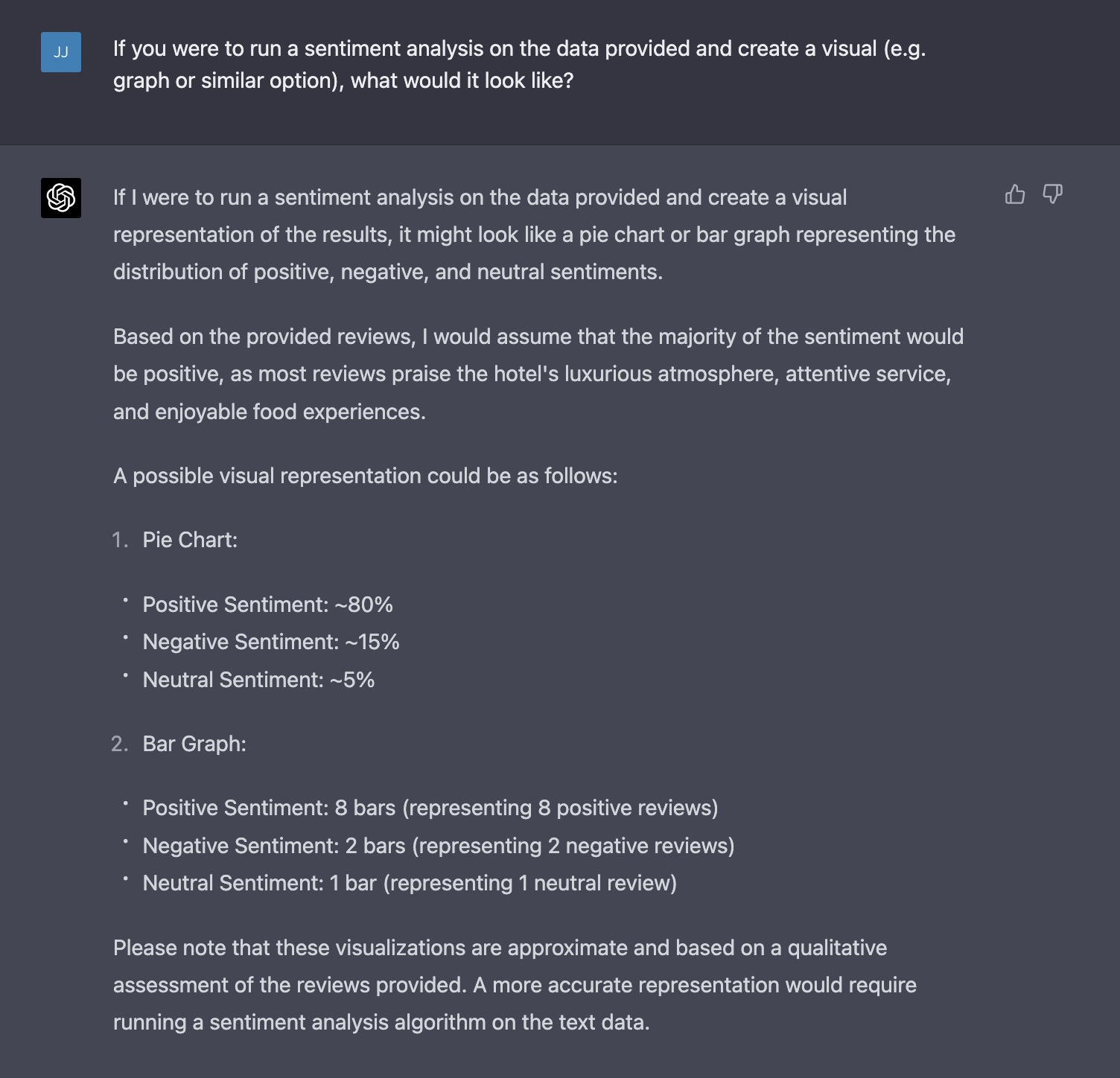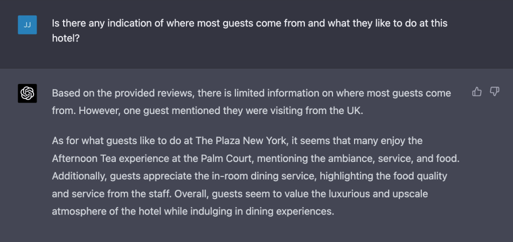Although the test above involved a small sample size of fewer than ten reviews, the potential for this system is far greater. Imagine feeding the AI ALL the available reviews from various sources (TripAdvisor, OTAs, Hotel Website, Guest Survey Responses**) and conversing with it naturally to obtain answers. This surpasses current options, as even the most advanced tools and services require significant effort to extract insights and can have complex interfaces, leading to a learning curve. However, integrating GPT4 (or a similar large language model) into these tools, with the ability to generate visualizations and work with closed data sets, would revolutionize guest sentiment analysis and allow us to identify the underlying causes of specific issues quickly and intuitively.