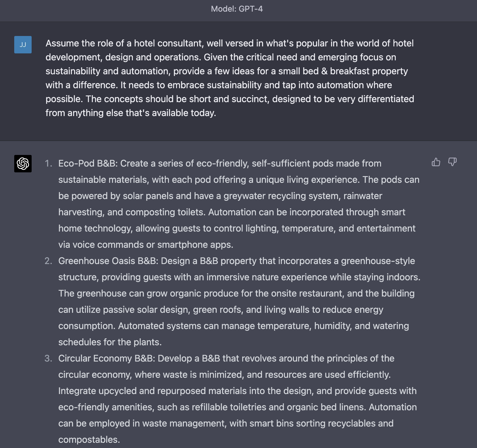 I asked for a few ideas for a Bed & Breakfast that incorporated both sustainability and tech automation trends.