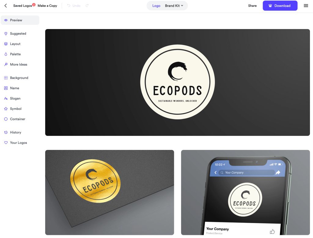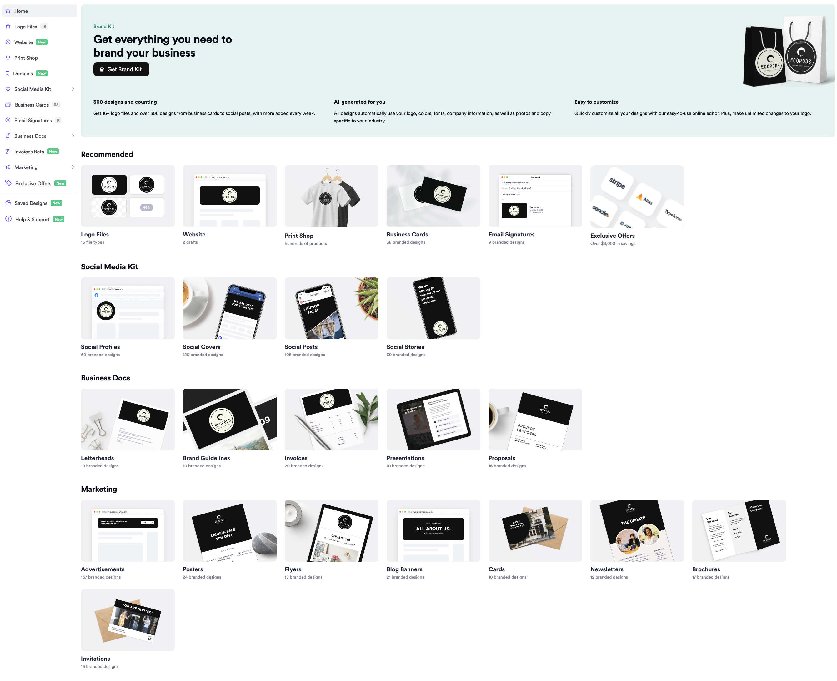 Looka offers an impressive AI-generated Brand Kit that includes 16+ logo files and over 300 designs for business cards, social posts, and more, which are easily customizable through their online editor.