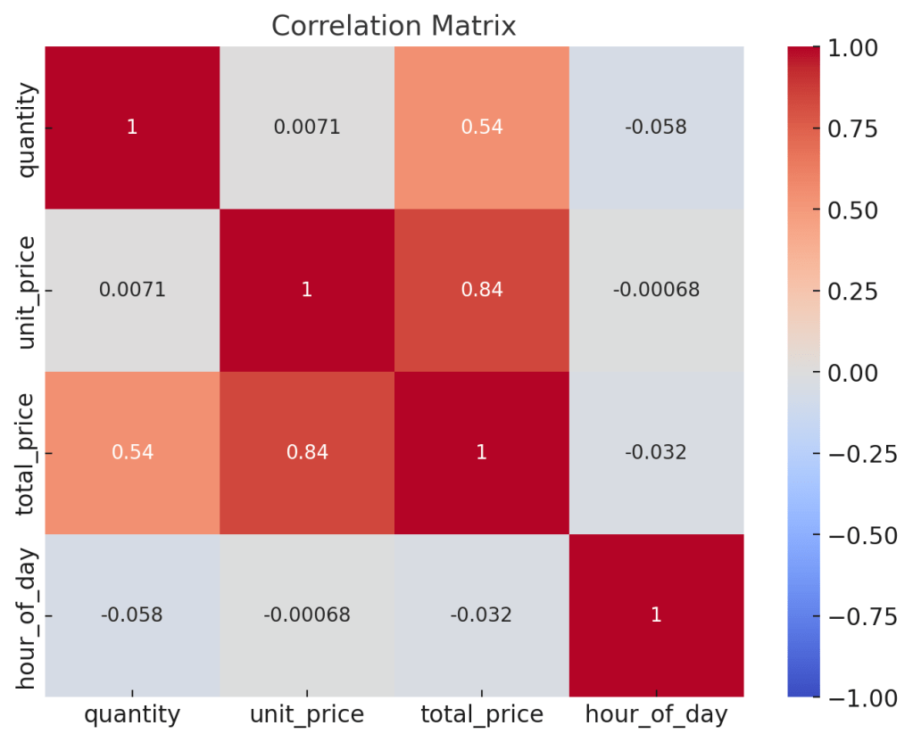 - Correlation Matrix: We could create a correlation matrix to see if there are any interesting relationships between different numerical fields in the data. For example, we might be interested to see if there’s a correlation between the hour of the day and the total price of orders.