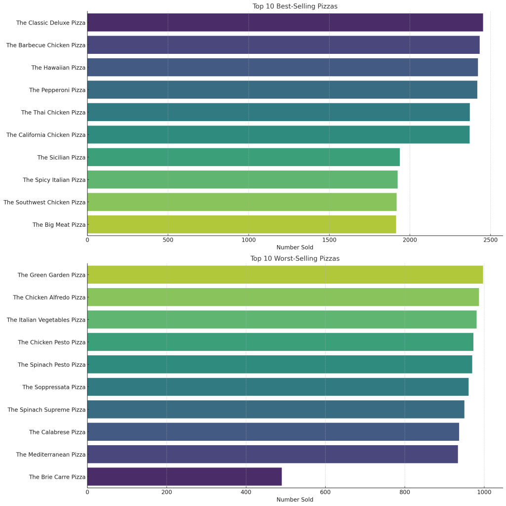 The best-selling pizza is “The Classic Deluxe Pizza” with a total of 2,453 pizzas sold. The worst-selling pizza is “The Brie Carre Pizza” with a total of 490 pizzas sold.