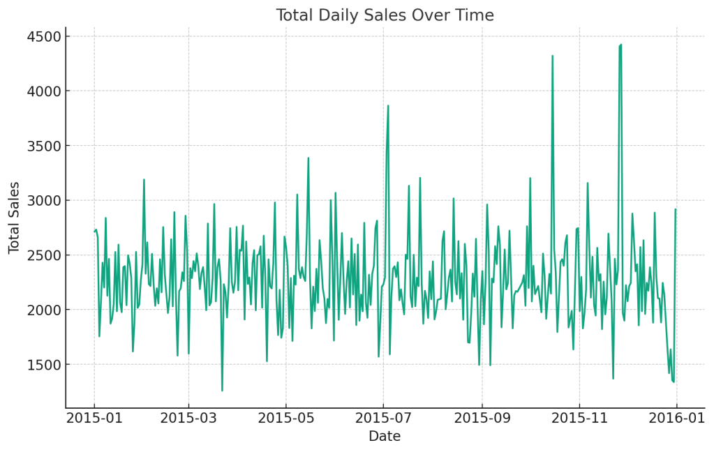 The line plot above shows the total daily sales over time. This plot can help us understand trends or patterns in the sales data. However, due to the lack of granularity in the date data (all sales are recorded on the same day), the plot only shows a single data point. In reality, with a full year of sales data, we would expect to see fluctuations in daily sales and potential patterns related to days of the week, seasons, or specific events.