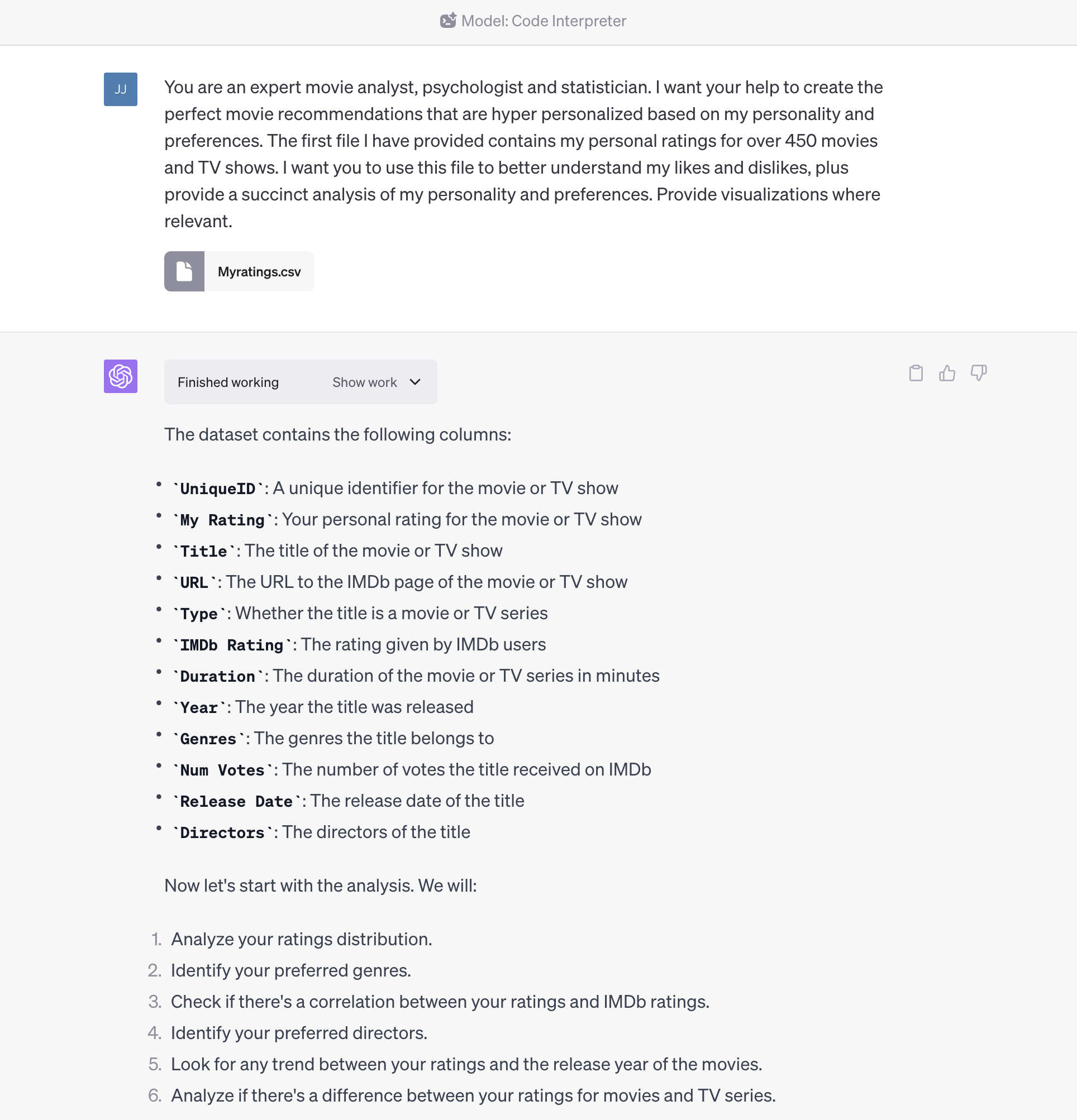 If you remember the first day of the 30 Day AI Challenge, I used ChatGPT to discover interesting movies that were otherwise hard to find using other sources like IMDB. Now, with Code Interpreter available, I wanted to experiment and take this to a whole new level. What if I could train ChatGPT to understand my movie and TV preferences better…and then analyze thousands of titles to recommend the best ones (kind of….Everything, Everywhere, All At Once?!).