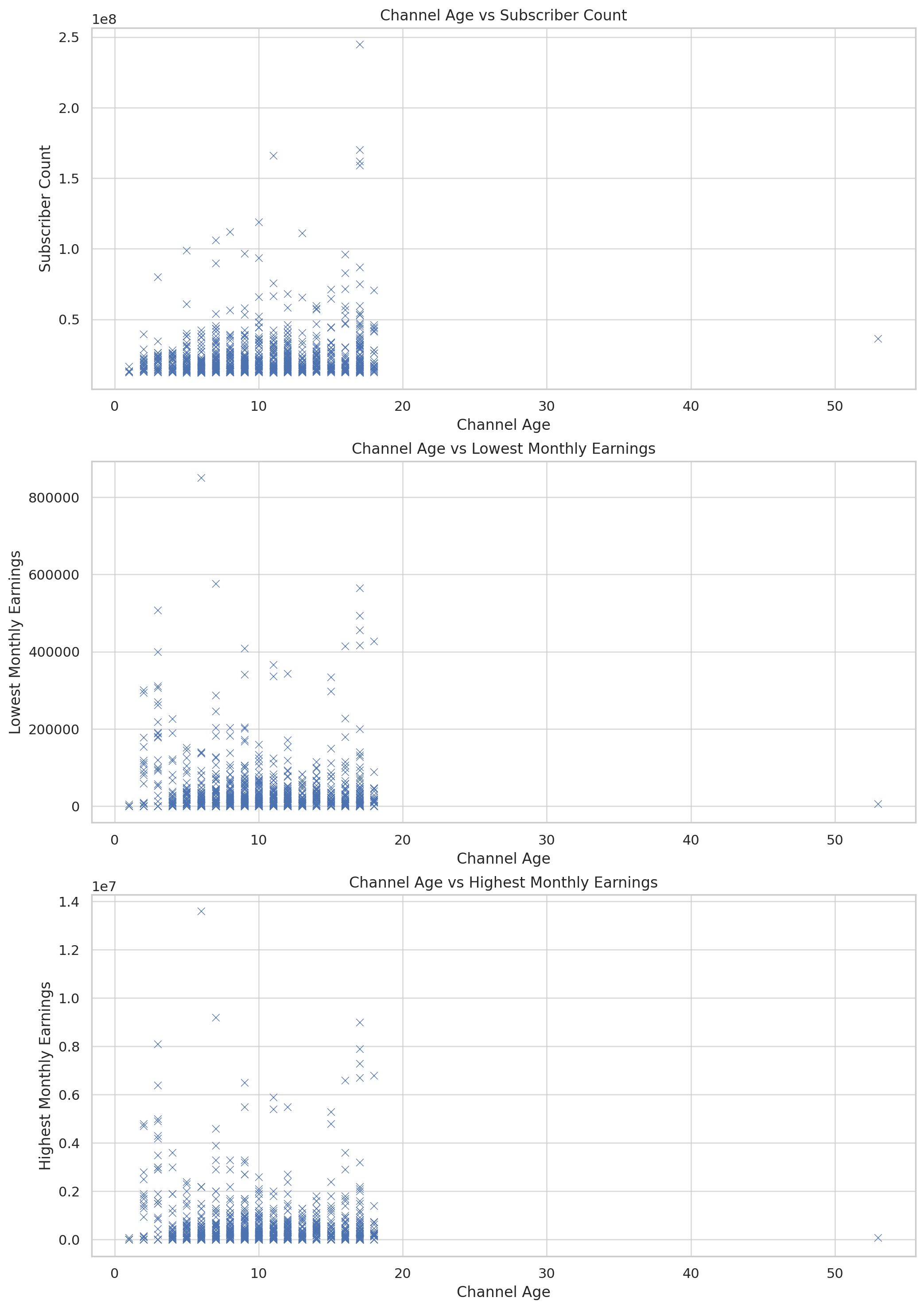 While older channels tend to have slightly more subscribers, channel age is not a strong predictor of success. Factors like content quality, audience engagement, and marketing efforts play more significant roles.