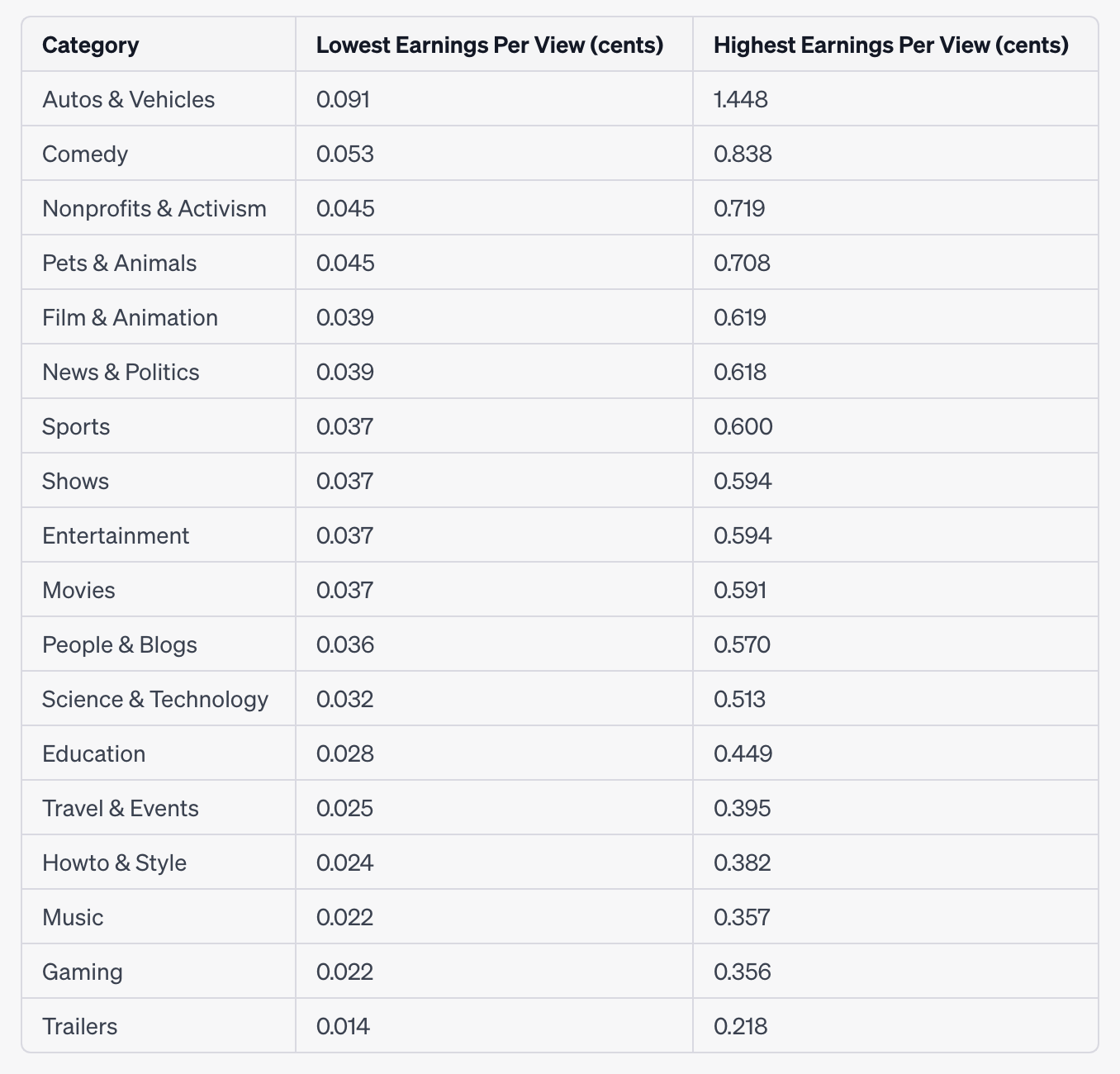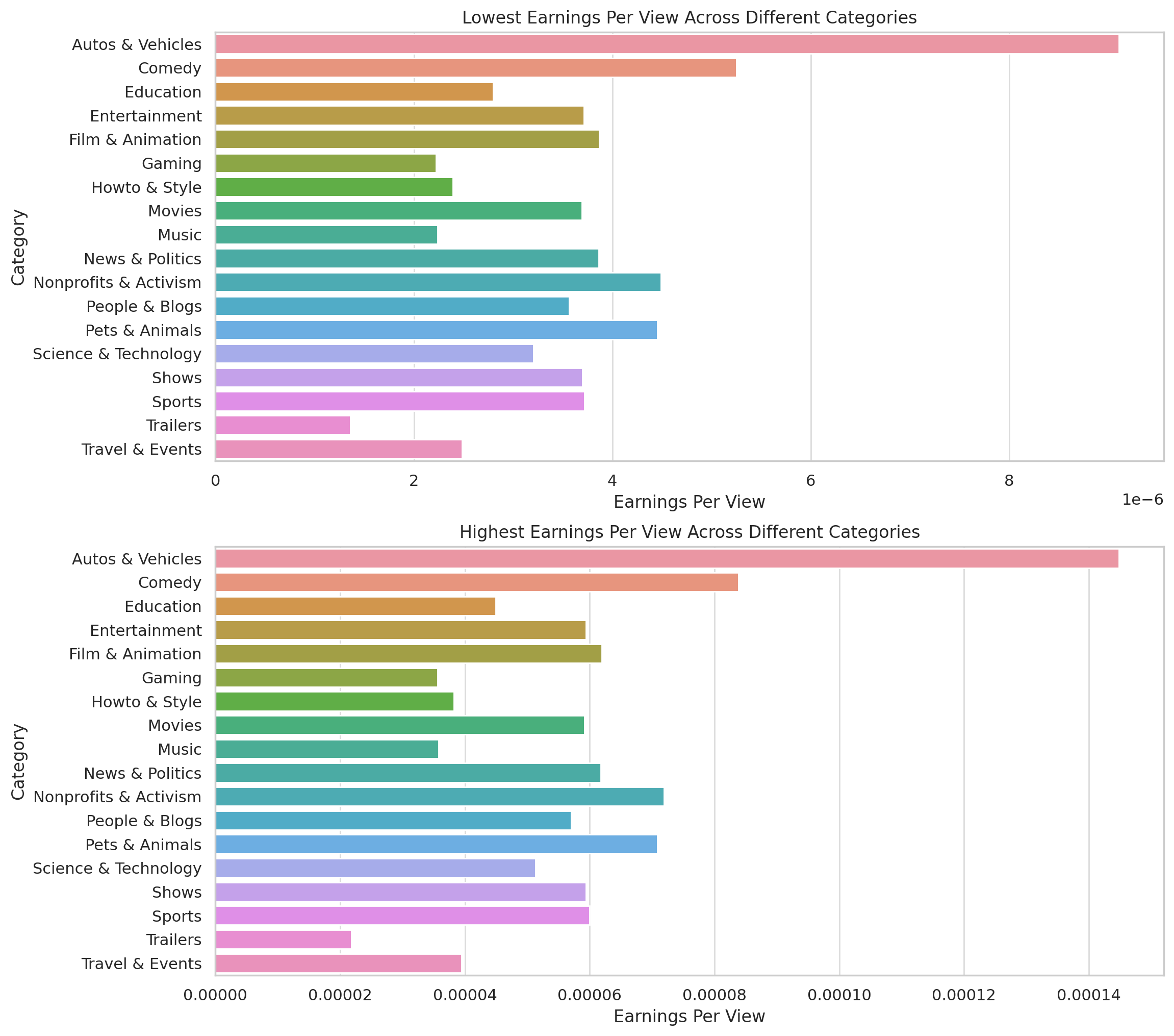 The earnings per view differ significantly across categories. The “Autos & Vehicles” category has the highest earnings per view, while the “Trailers” category has the lowest.