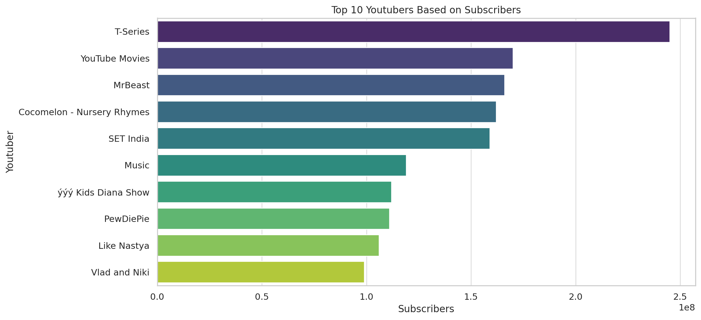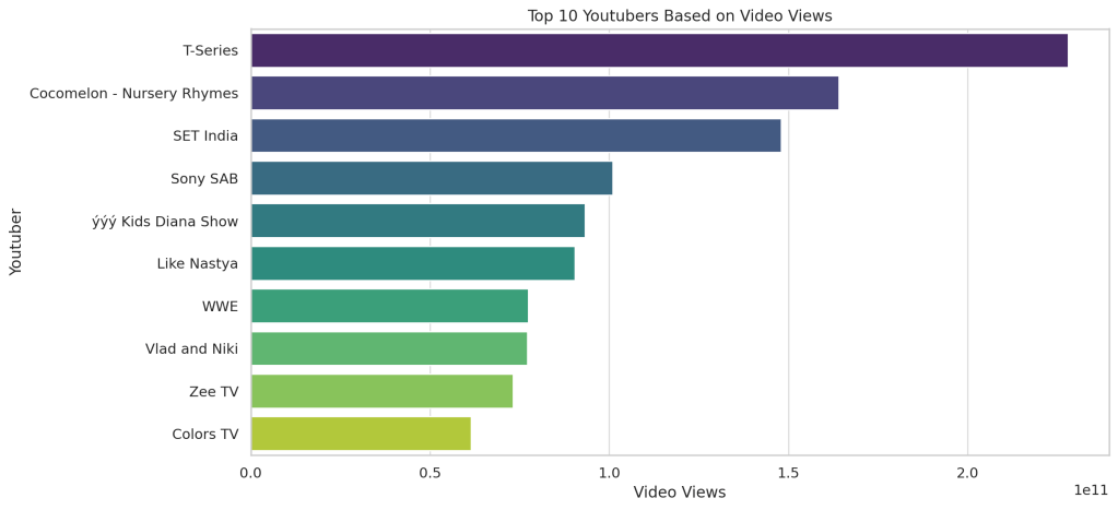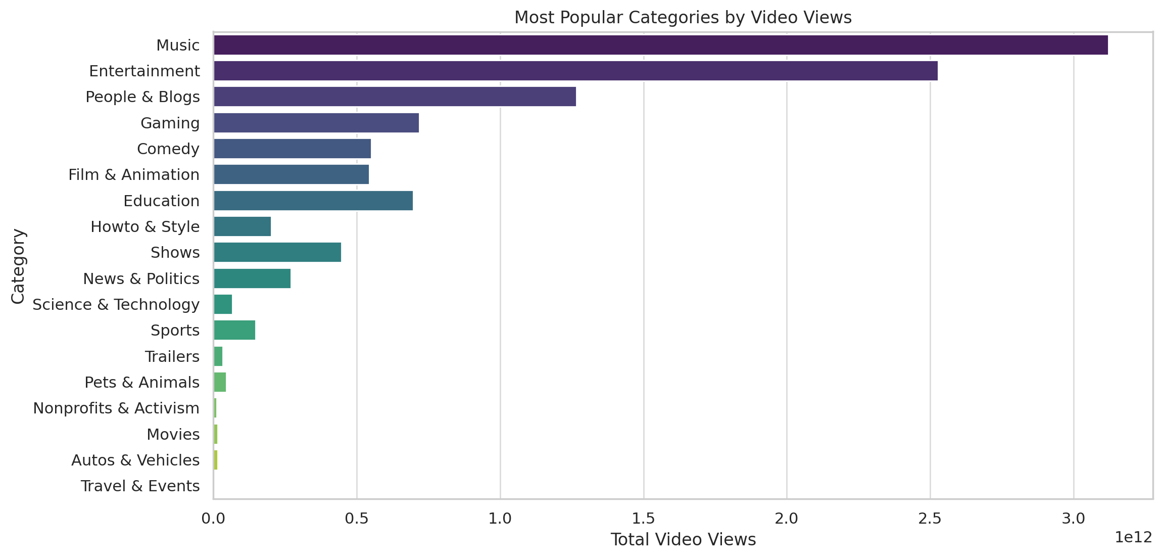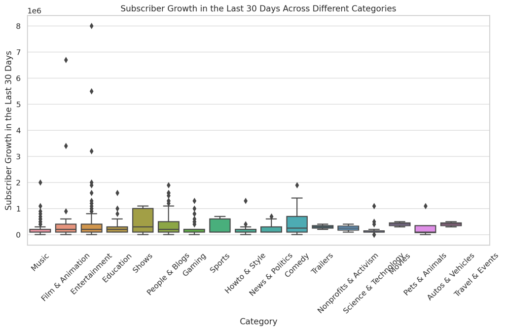 Channels in the “Music,” “Film & Animation,” and “Entertainment” categories tend to have higher subscriber growth and earnings. Meanwhile, categories like “Gaming” and “Education” have lower median earnings.