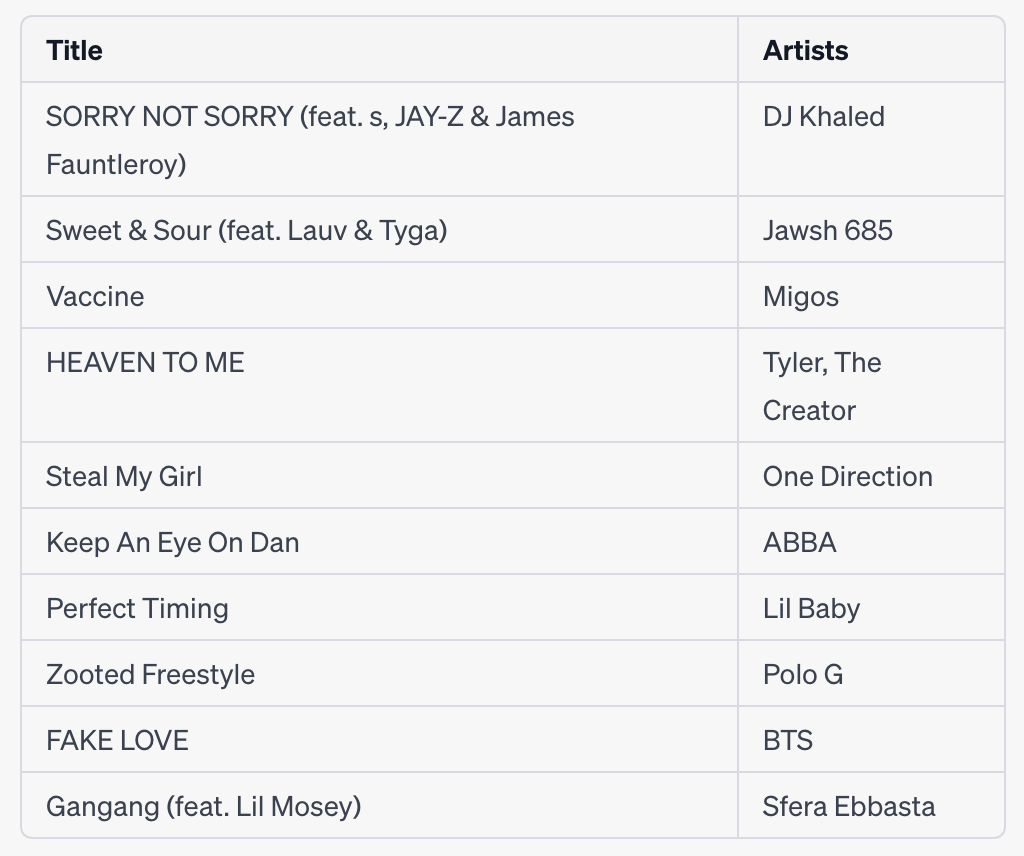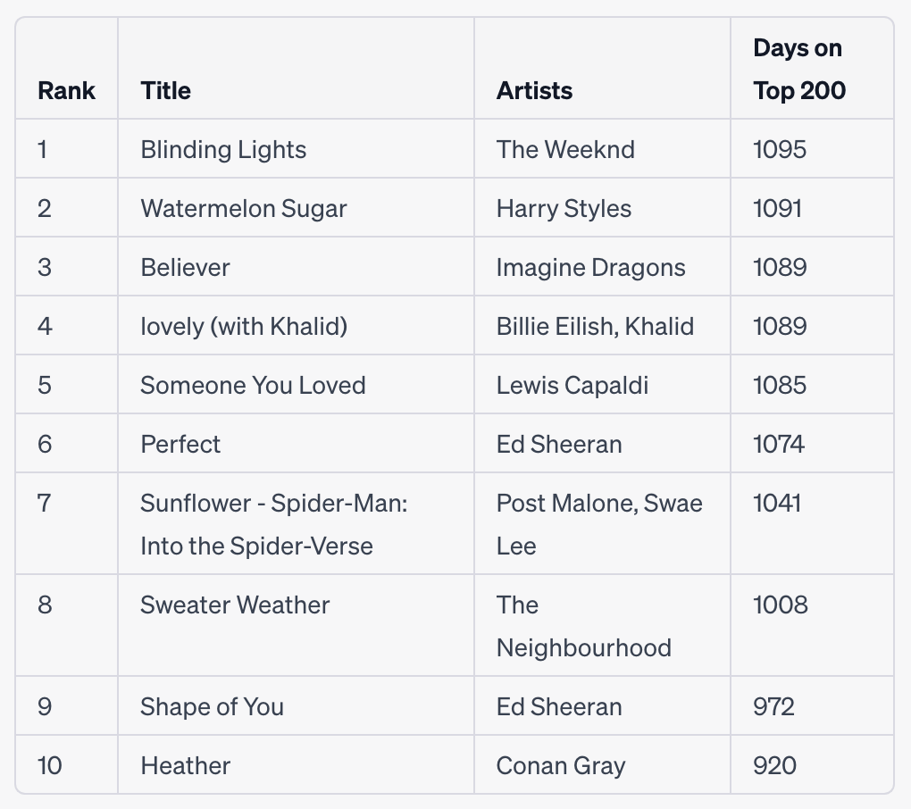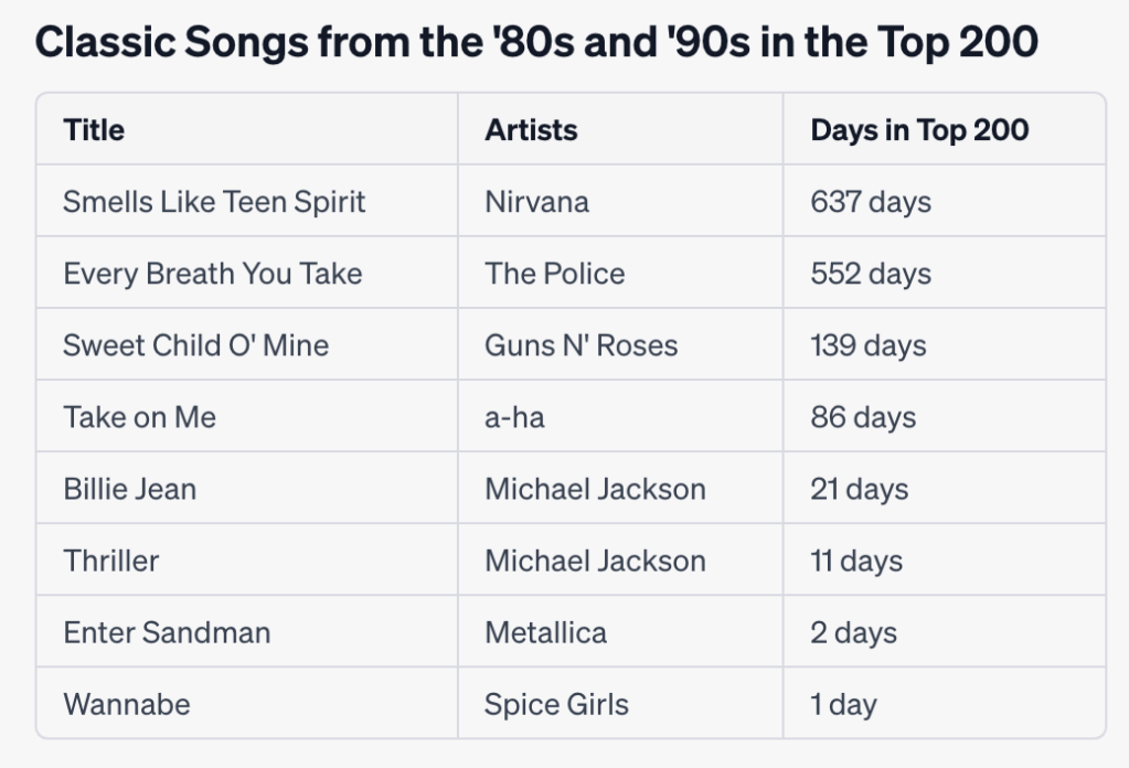 Prompt: I have a diverse taste in music, with a leaning towards rock and pop. Growing up in the 80’s and 90’s, I have a soft spot for popular artists and songs from these decades. While the release date for these titles isn’t provided in the dataset, can you use your own training to identify any older songs that still appear often in these rankings?