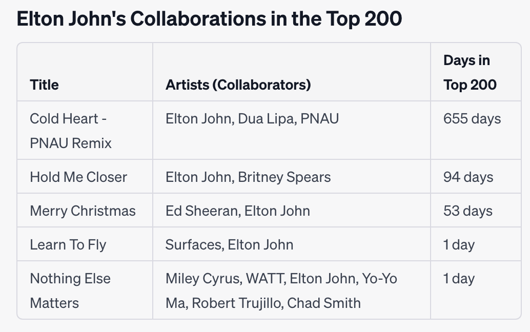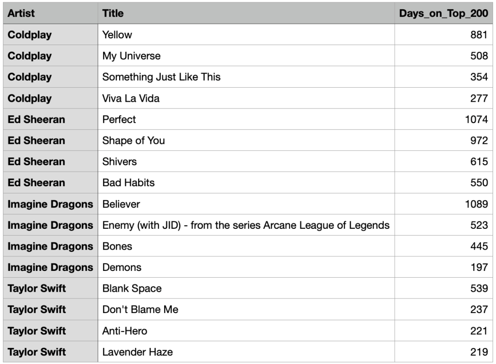 Prompt: Out of the previous top 20 artists list we created, let’s say I like songs by Taylor Swift, Coldplay and Imagine Dragons. Which of these artists’ songs have appeared on the top 200? Summarize by artist and sort in descending order in terms of how many days these songs have appeared on the list.