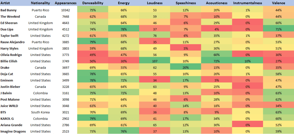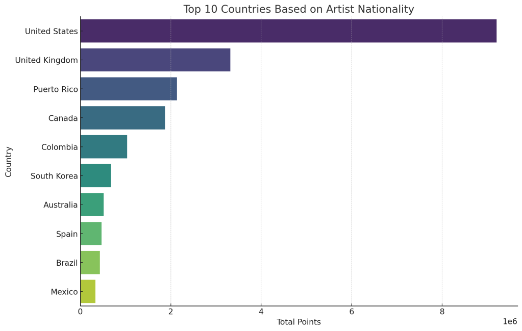 Based on a Country level analysis, the United States clearly dominates, followed by the United Kingdom and Canada. This perhaps isn’t surprising given the global influence of artists from these countries. However, it’s interesting to see other nations like South Korea and Colombia also making a mark on the global stage.