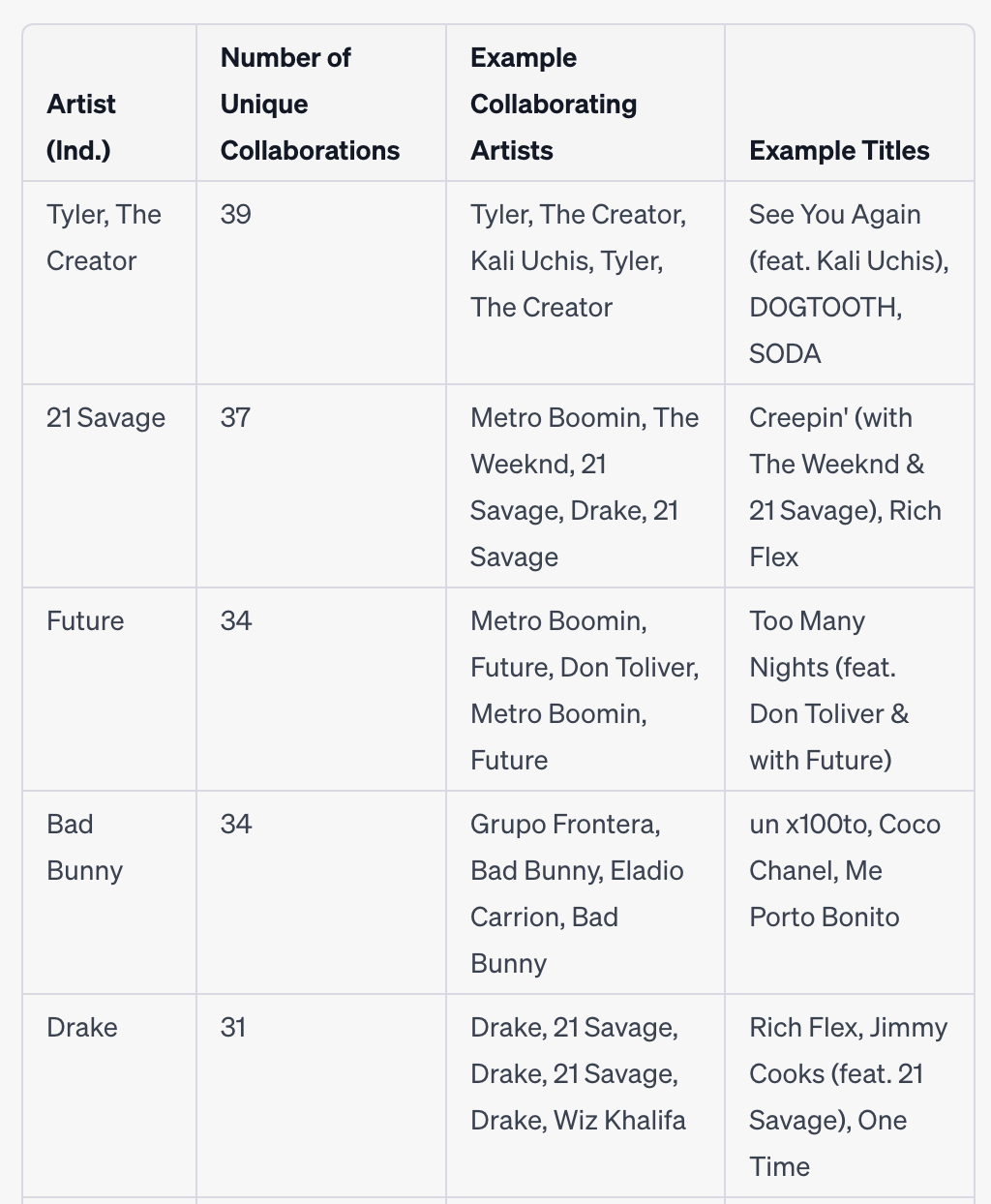 While the above data is based on individual contributions, we also checked on collaborations. The table below shows the top 5 collaborative artists based on unique titles in the dataset: