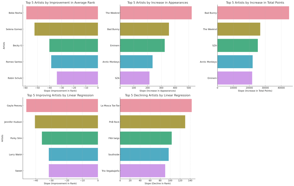 This chart uses linear regression on the rank data to identify the top 5 artists who have shown the most improvement over the past three years. A lower slope indicates improvement.