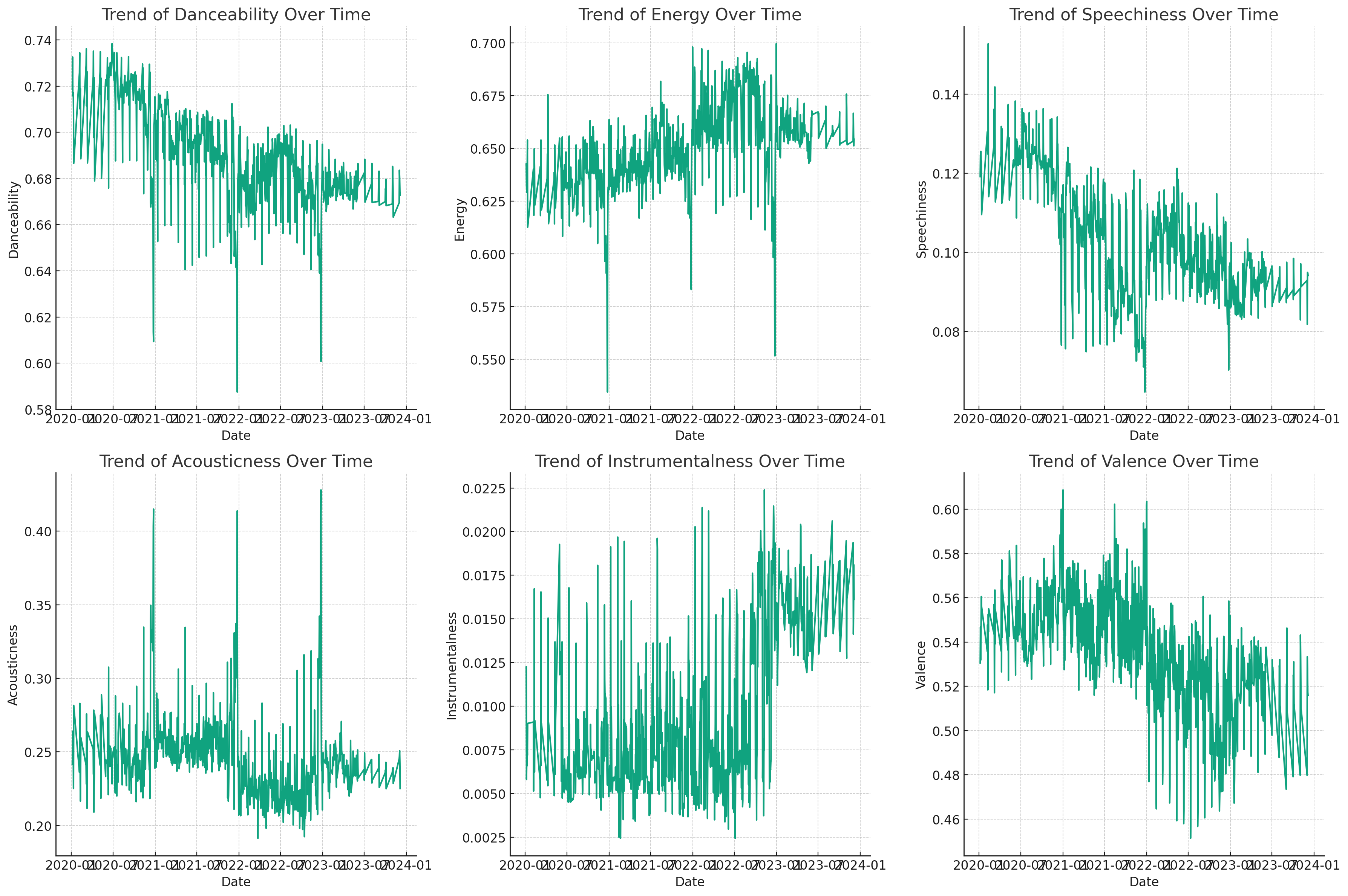 The series of line graphs below depict how various audio features—Danceability, Energy, Speechiness, Acousticness, Instrumentalness, and Valence—have evolved over the span of three years, from 2020 to 2023.