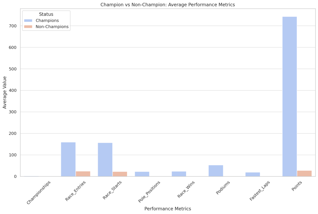 - Pole Positions: Champions have significantly more pole positions on average, indicating better qualifying performance.