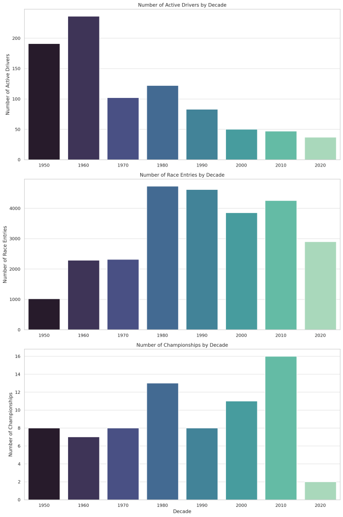 - Technological Advancements: The role of technology in F1 has increased manifold, impacting everything from car design to race strategy. This could explain the evolving metrics across decades.