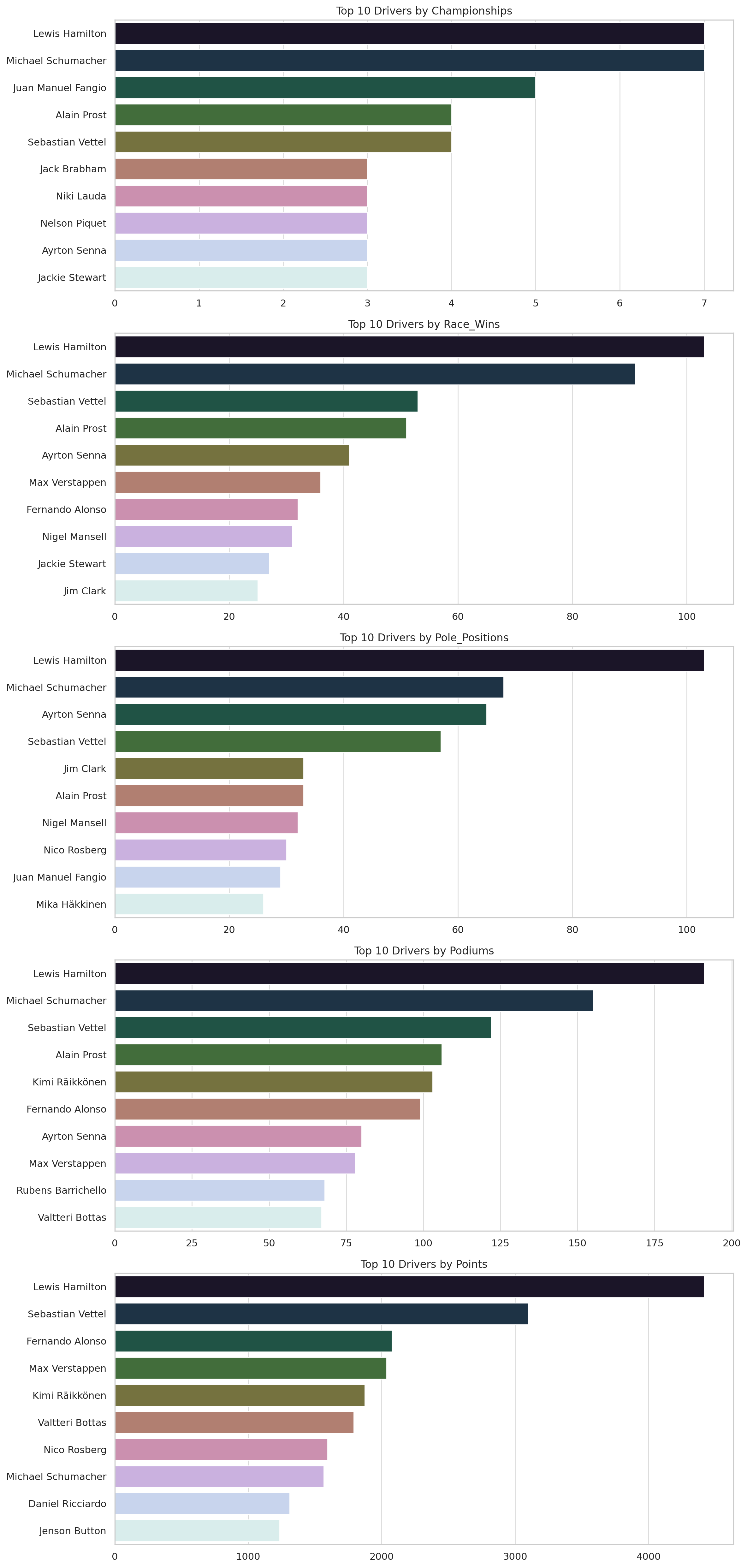 - Championships: Most drivers have not won a championship, but the maximum number of championships won by a driver is 7.