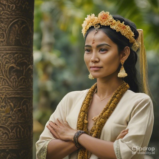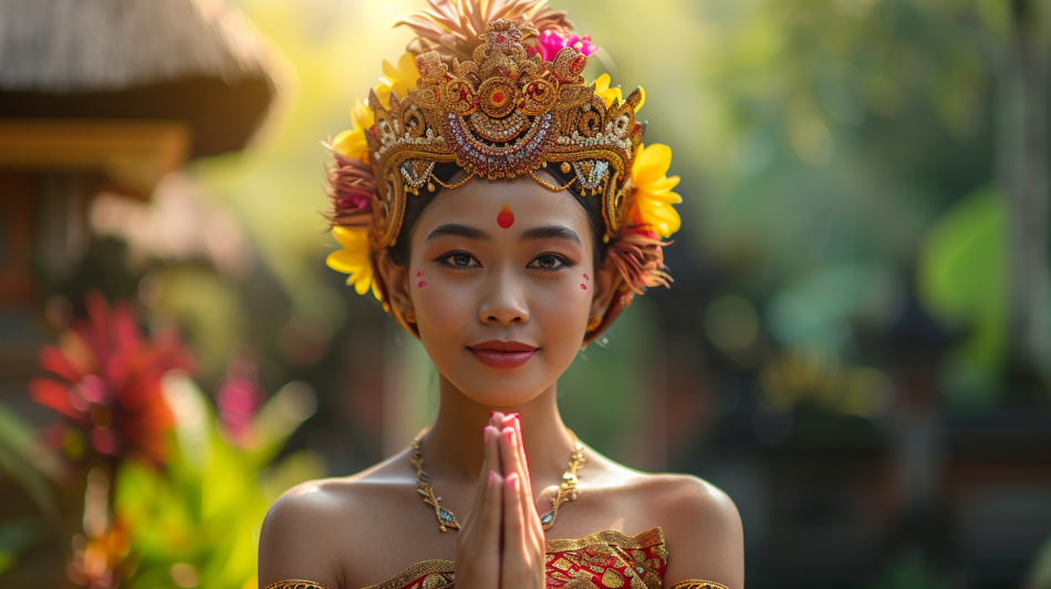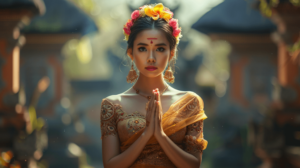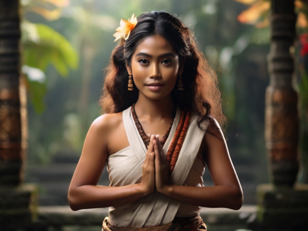 - Beautiful Balinese Woman with folded hands, welcome to Bali, Cinematic, Centered Studio Portrait, 4k, Nature in background