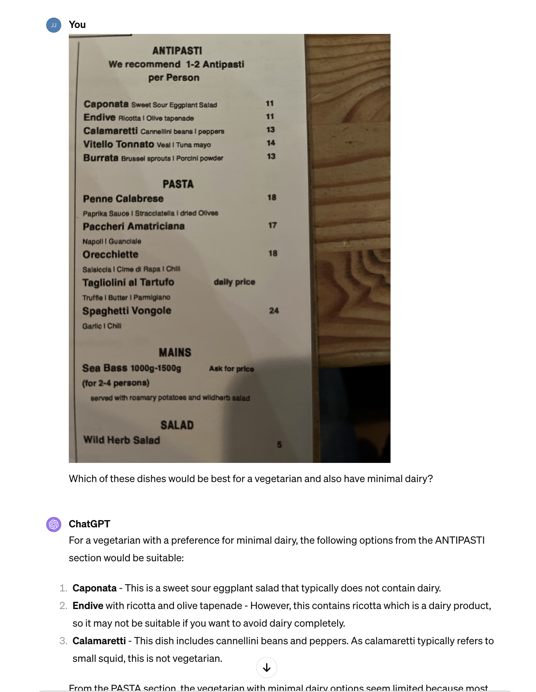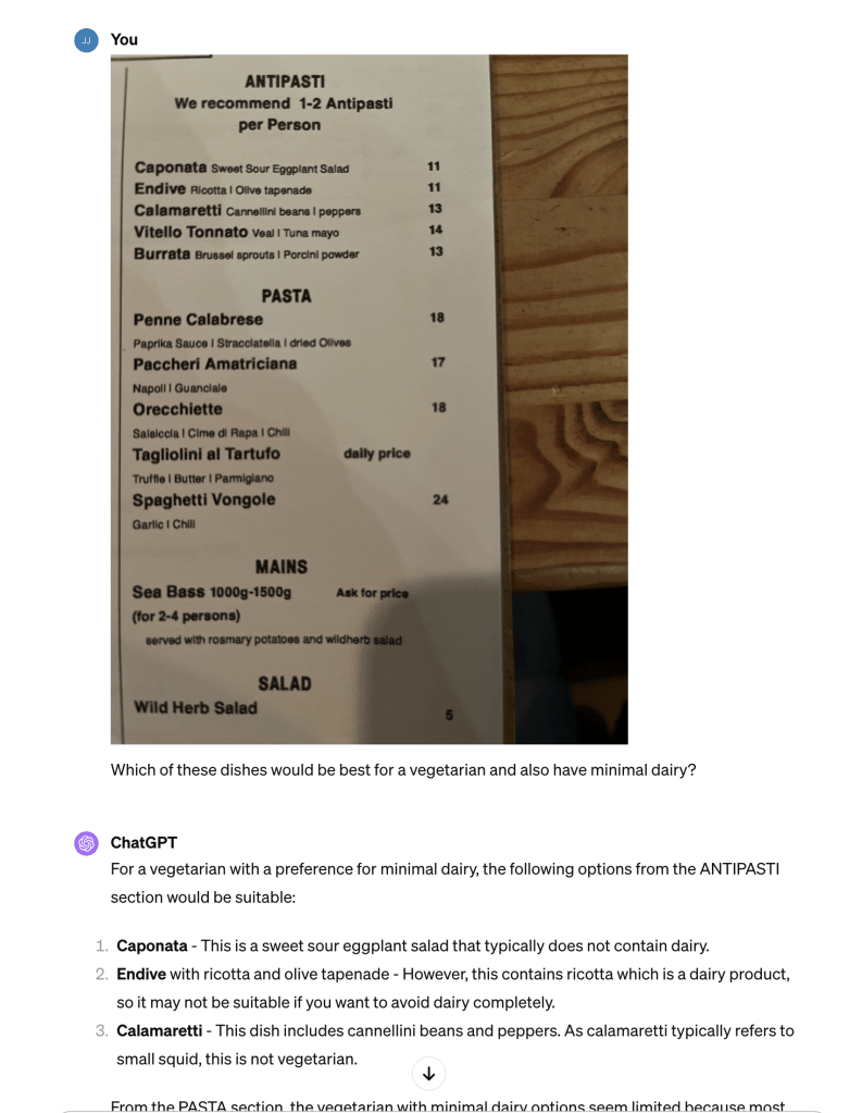 - Task: While on your trip, use your favourite AI Chatbot to solve at least one travel-related problem or question that arises, such as finding nearby pharmacies, interpreting local transportation schedules, or suggesting indoor activities for rainy days. Example below, where I gave ChatGPT a picture of a menu while travelling and asked for specific dietary recommendation.