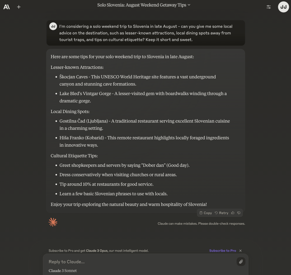 - Task: Ask your favourite AI Chatbot for local advice on your destination, such as lesser-known attractions, local dining spots away from tourist traps, and tips on cultural etiquette. Example using Claude below.