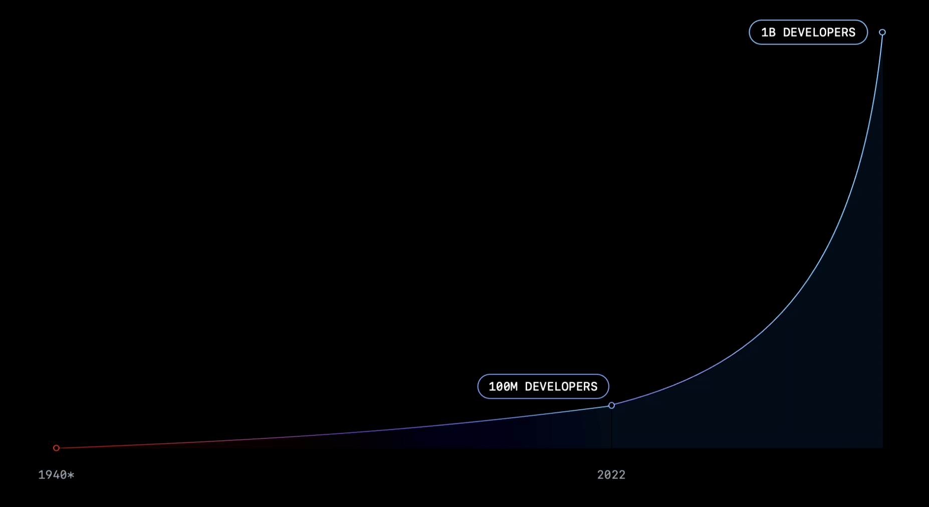 Again, a prediction that’s more plausible than it is not. After all, the best technology is rarely the hero of the story…it fades into the background and makes our lives better, often without us noticing. Even Thomas Dohmke, the CEO of Github, repeated this prediction in his own talk, where he claimed that with natural language making coding a lot more accessible, the number of “programmers” would like shoot up from 1% of the world’s population to about 10% (or roughly a billion people).