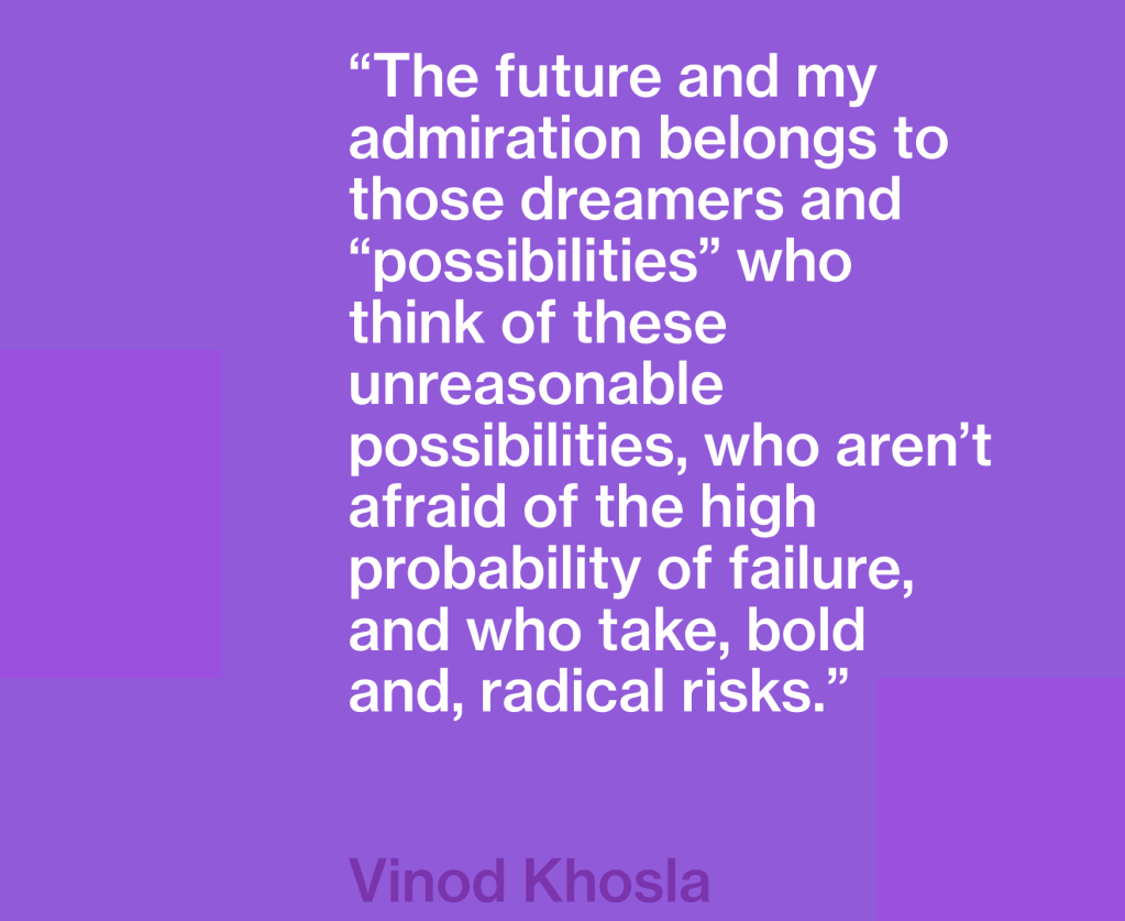Khosla recently gave a talk at TED 2024 and shared his views on the possible (positive) ‘improbables’ in our future. In his opinion, experts tend to extrapolate the past…they don’t think non-linearly and don’t think of the improbables, thereby restricting radical progress. Khosla thinks implausible dreams are critical, even if we don’t know which are most likely and entrepreneurs (and not experts in the field) are a unique breed that dream the dream and often bring these grand visions to life.