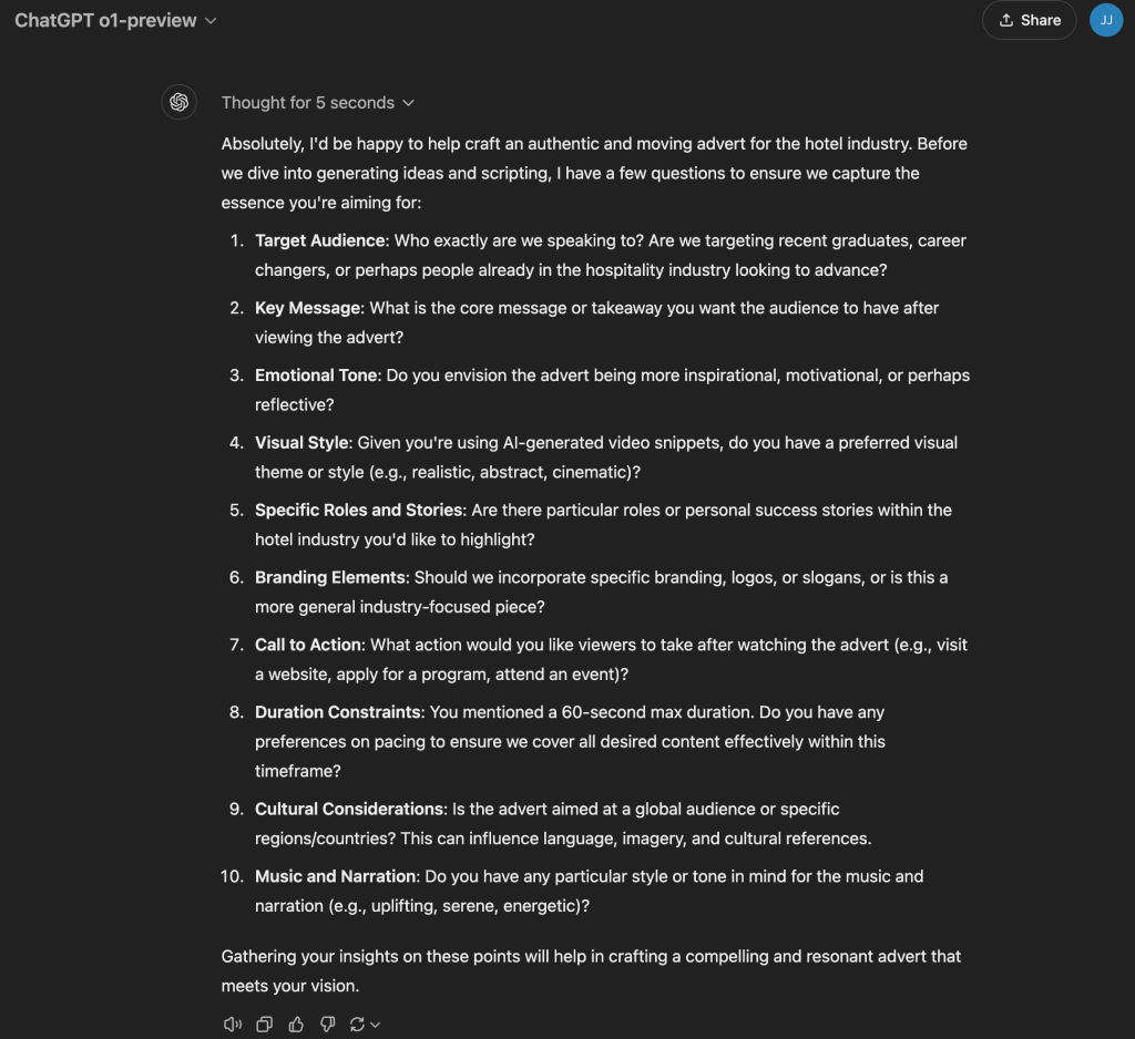 Every great project starts with a solid plan. I turned to ChatGPT o1-preview, OpenAI’s powerful new language model, to brainstorm ideas and craft the script.