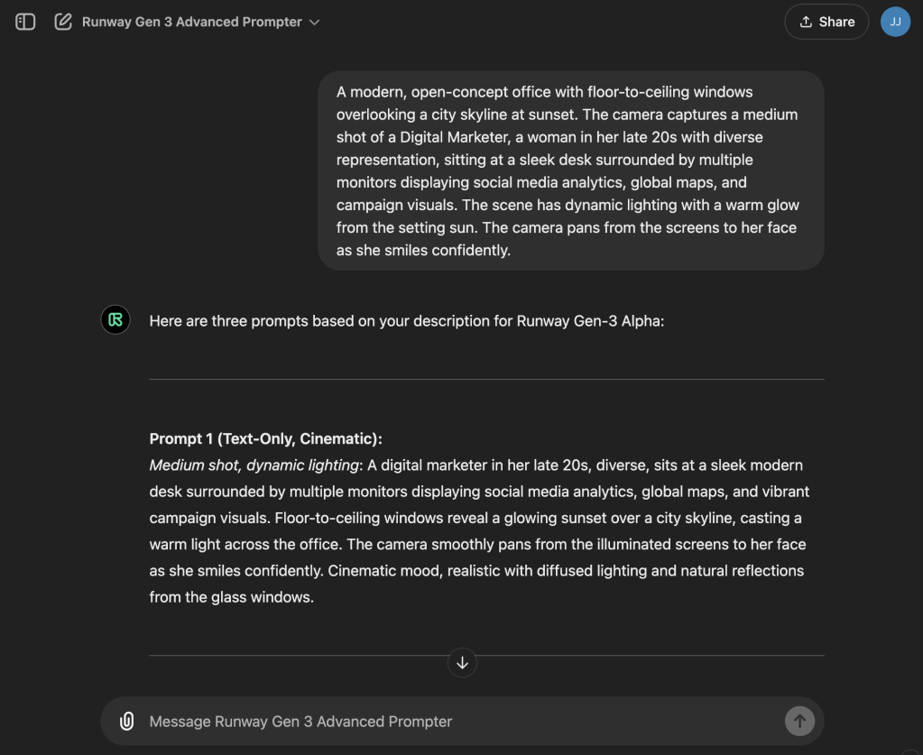 Static images needed movement to create a dynamic ad. To speed up the prompting process, I also created a new custom GPT that generates 3 prompt options based on simple inputs and has access to Runway’s prompting guide and examples for inspiration.