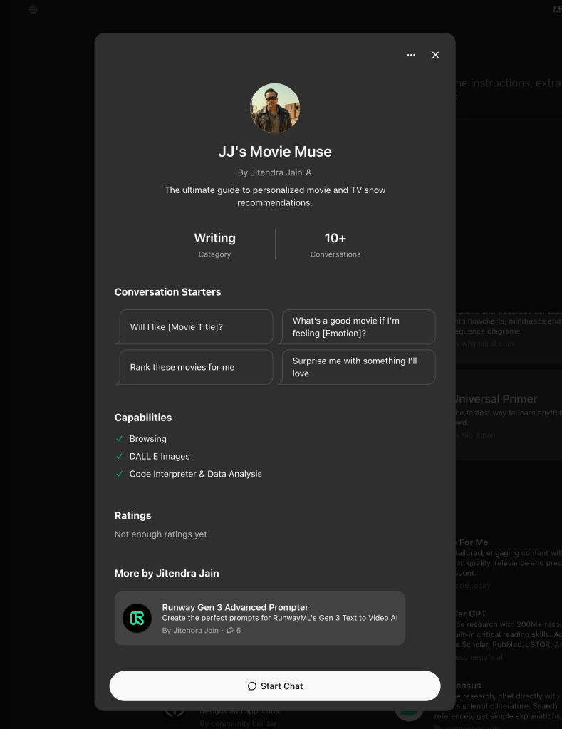 But I wanted to take things a step further this time. I wanted something I could use when I’m anywhere—on the couch, on the move, or even up in the air, deciding what to watch next. That’s when I decided to build a Custom GPT—my very own AI Movie Muse. This GPT isn’t just any recommendation tool; it’s fine-tuned to know exactly what I like based on my IMDb ratings, my mood, and even my quirks as a movie lover.