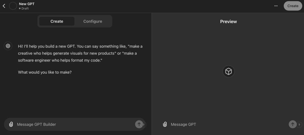 For Beginners: If you’re not super comfortable providing the detailed instructions, you can also leverage the “Create” mode and have ChatGPT do the work for you based on what you tell it.