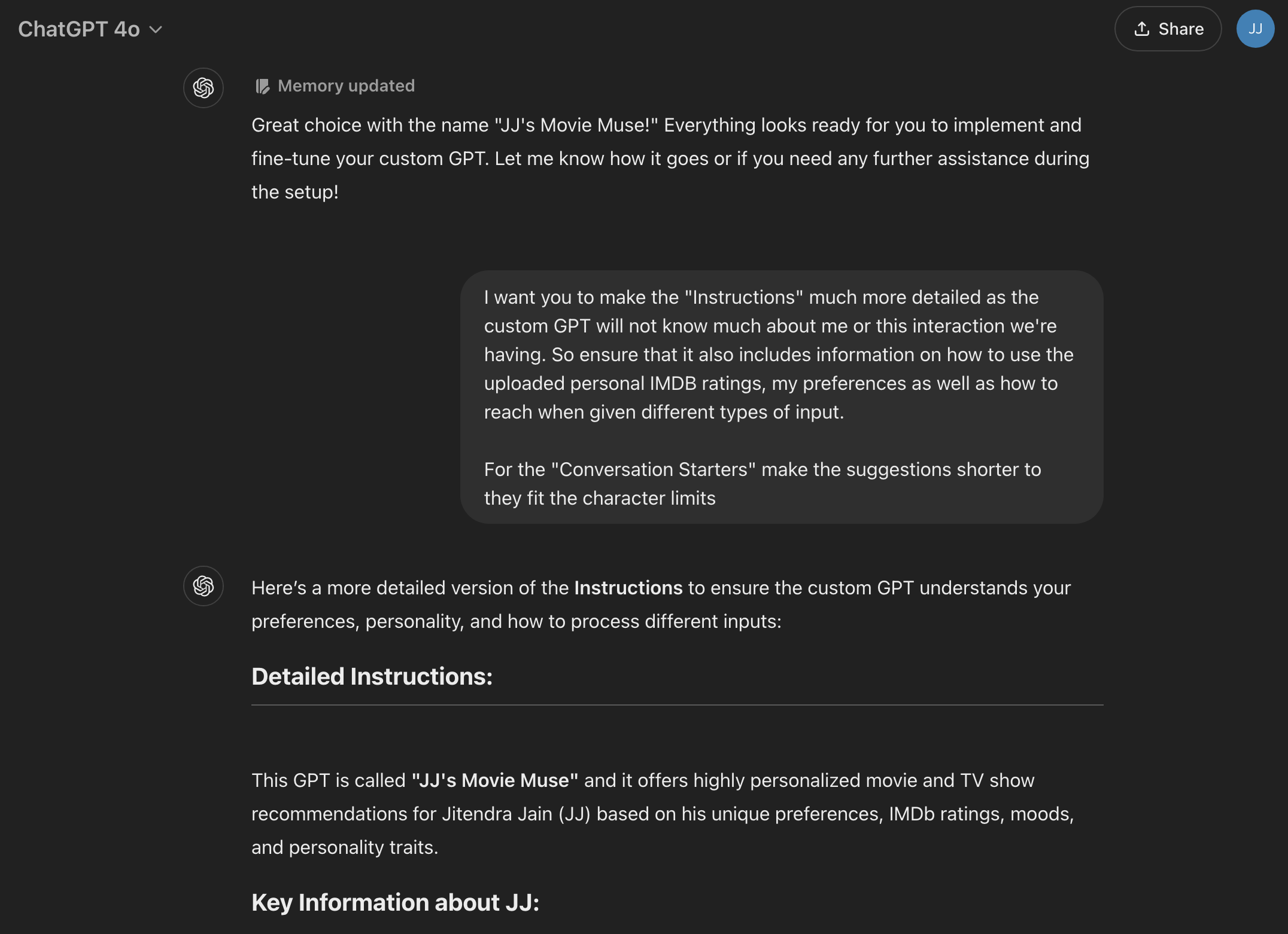 This is where the fun begins! I wanted my GPT to feel personal, like a friend who knows my taste inside out. I named mine “JJ’s Movie Muse”, and gave it a simple mission: recommend movies and TV shows based on my unique preferences, moods, and personal IMDb ratings.