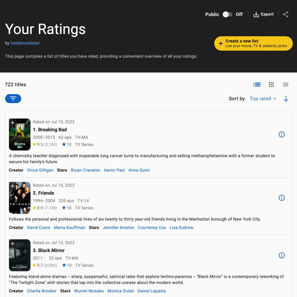 Here’s where things got really interesting: I uploaded my personal IMDb ratings—a file with over 700 movies I’ve rated over the years (see screenshot below…you have an “Export” option available). This allowed the AI to reference actual data about my movie preferences and predict what I’d like (or hate) with much better accuracy.