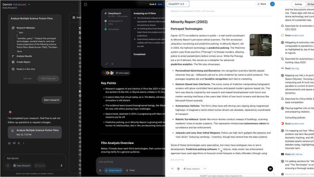 To answer this very serious (and slightly anxiety-inducing) question, I turned to my trusty trio of AI research wizards: ChatGPT Deep Research, Google Gemini Deep Research, and Grok 3 DeeperSearch. These digital sleuths trawled through hundreds of reputable sources, from expert interviews and academic papers to tech reports and endless Reddit debates, analyzing which cinematic futures are frighteningly near and which remain comfortingly distant.