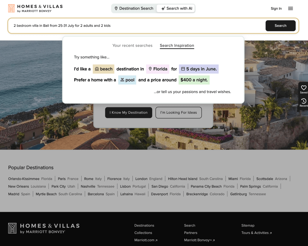 Or Booking.com, whose AI-powered review summaries and smart filters mean you no longer have to scroll through 127 posts about “great location!” and “decent breakfast” to find out if the shower pressure will ruin your morning. Marriott’s Homes & Villas site has rolled out similar natural language search features, making it easier for users to ask real-world questions like “family-friendly villas for 2 adults and 2 kids with a pool” and actually get relevant results quicker than having to sort through loads of filters.