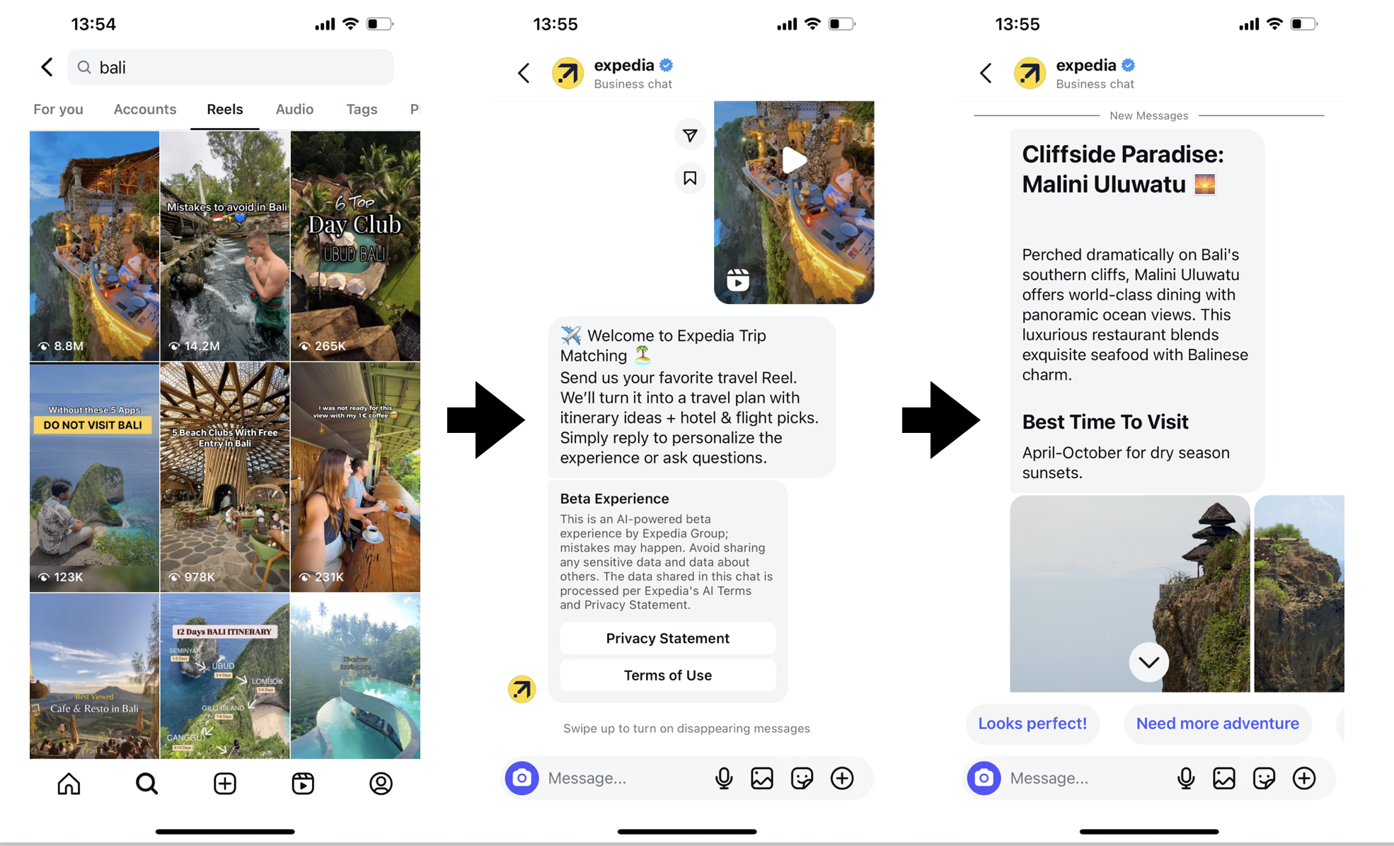 Expedia took it a step further with Trip Matching: drop them an Instagram Reel and get a full itinerary in return. Like magic, if the magician also booked your rental car. Here’s a quick test I did using a reel from Bali…and it got the location exactly right.