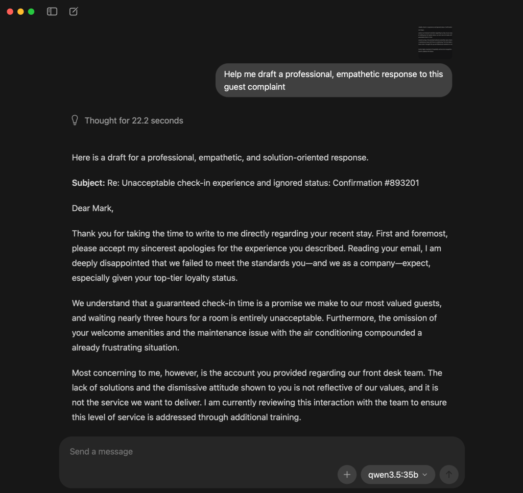 Test 3: The Guest Complaint (MacBook, Qwen 3.5 35B) I pasted in a realistic hotel guest complaint email (a frustrated loyalty member, three-hour check-in delay, dismissive front desk staff, broken AC) and asked for a professional, empathetic response. The result was genuinely impressive. It addressed every issue, struck the right tone, acknowledged the loyalty status, and proposed specific remediation. The kind of response that would pass muster with most hotel GMs. This, I thought, is what local AI is actually built for: working with text you give it, not facts it needs to remember.