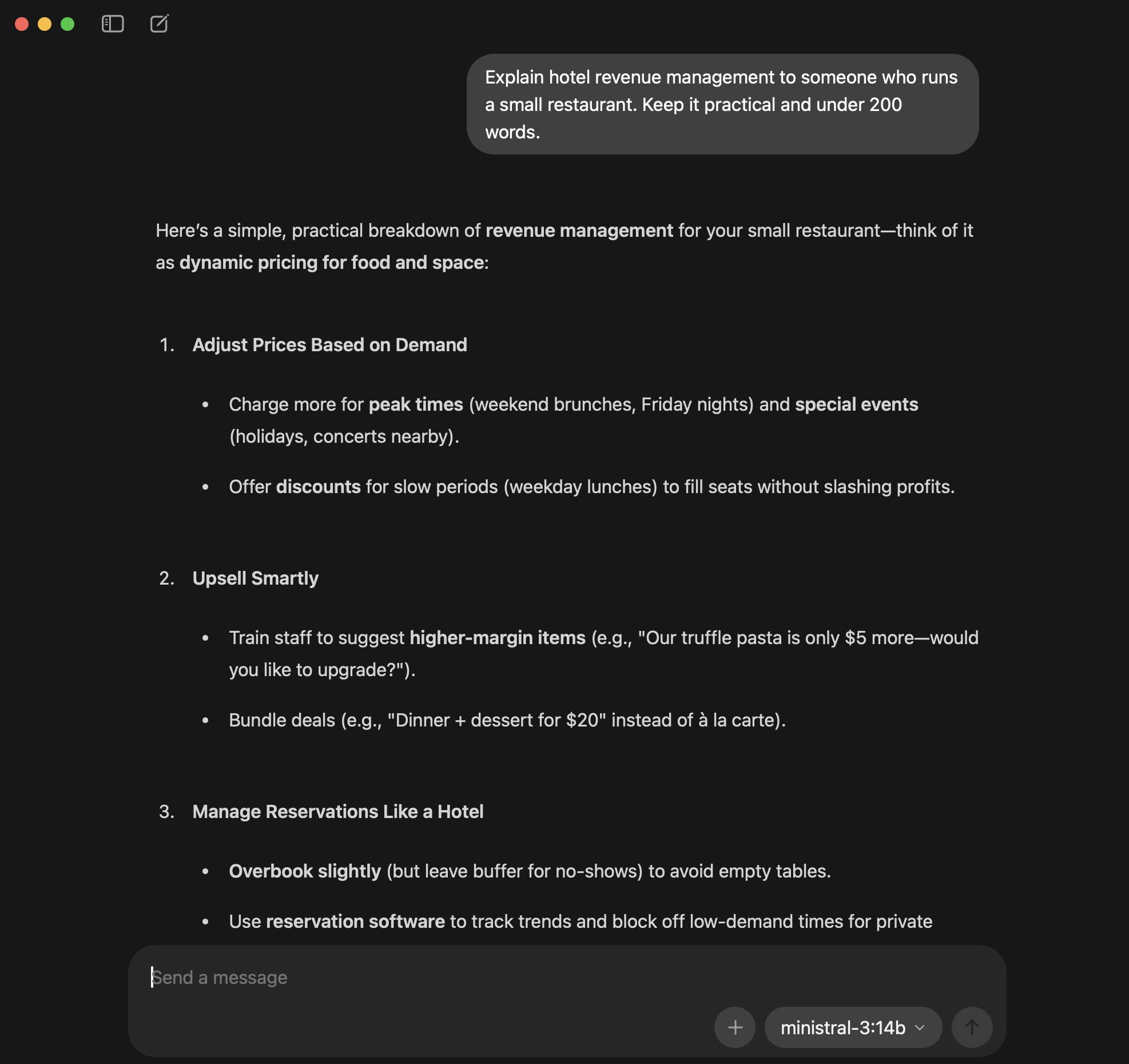 Test 4: The Domain Translator (MacBook, Ministral 3 14B) I asked it to explain hotel revenue management to someone who runs a small restaurant. Keep it practical, under 200 words. It immediately reframed dynamic pricing in restaurant terms (peak vs. off-peak, upselling, managing reservations like room inventory). Clear, useful, something you could actually hand to someone. No fabrication needed because the task was about reasoning and reframing, not recall.