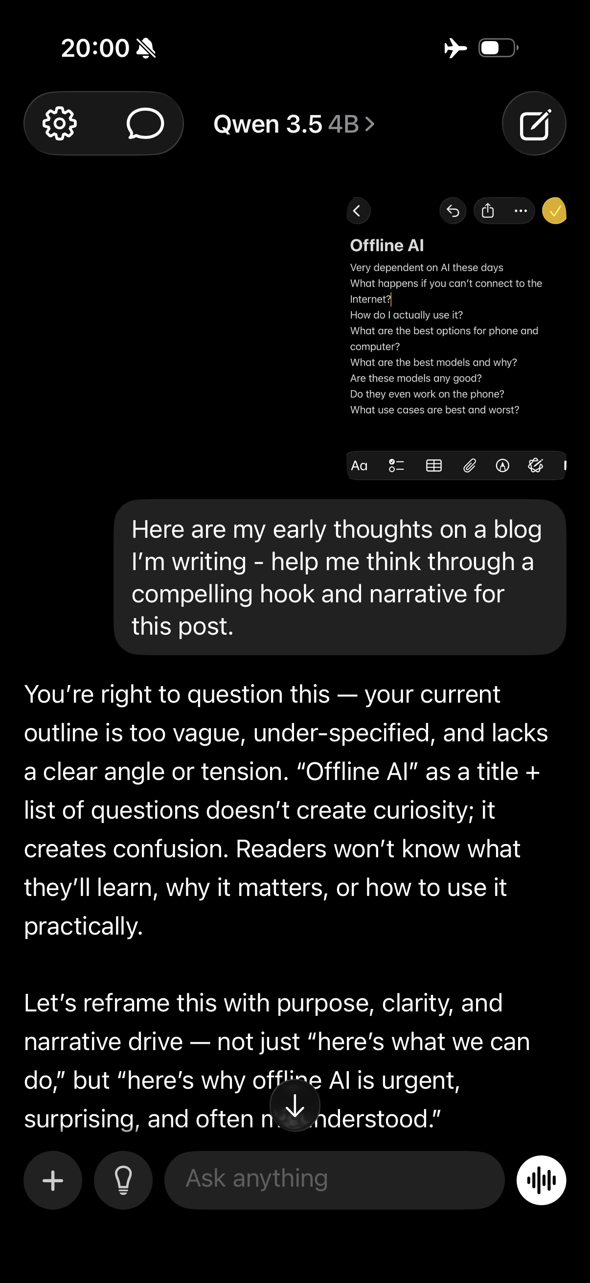 I found a layer of AI that’s free, private, and always available. It won’t replace Claude or ChatGPT for serious research or complex tasks. But for thinking through problems, drafting communications, restructuring messy ideas, and working with text you supply… it’s already genuinely useful. Today. On your phone. On airplane mode.