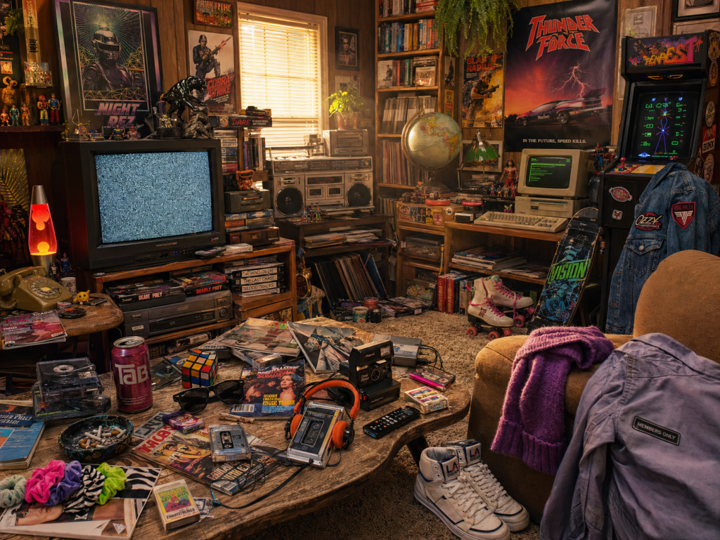 Everything 1980s packed a suburban living room with a CRT showing static, VHS tapes, a boombox, a Rubik’s cube, a rotary phone, wood-panelled walls, a lava lamp, Ray-Ban Wayfarers, a skateboard, a Walkman with orange foam headphones, a can of Tab cola, a Polaroid camera, roller skates, an arcade cabinet, a Members Only jacket, and a beige computer with a green-screen monitor. The warm, golden light through venetian blinds ties it all together.