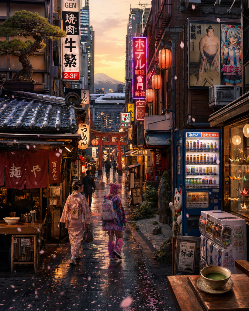 Everything Japan compressed past, present, and future into a single Tokyo alley at golden hour. Traditional roof tiles next to neon signs. A torii gate at the end of the street. A woman in a kimono walking past someone in Harajuku street fashion. Cherry blossoms drifting through the air. A vending machine. A ramen shop. A bullet train visible through a gap between buildings. Mount Fuji on the horizon. Matcha on a counter in the foreground.
