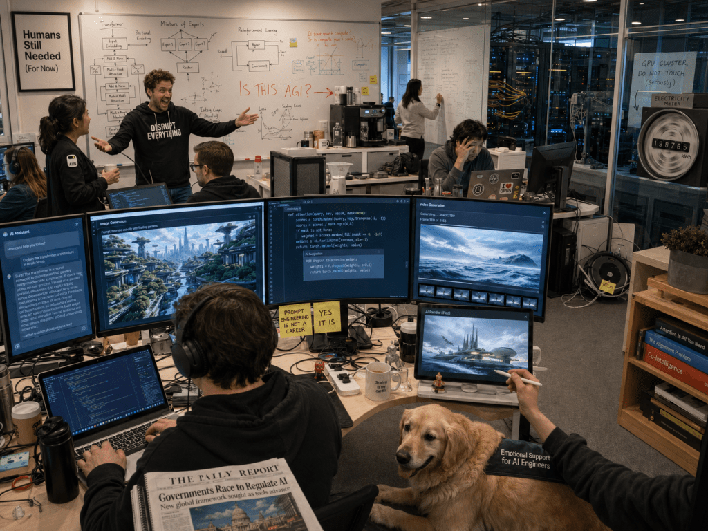 Everything AI in 2026 captured the beautiful chaos of this exact moment: multiple screens showing different AI interfaces, a whiteboard reading “IS THIS AGI?” with an arrow pointing to the coffee machine, sticky notes reading “PROMPT ENGINEERING IS NOT A CAREER” next to “YES IT IS”, a GPU server rack with a spinning electricity meter, an “Emotional Support for AI Engineers” vest on a dog, and a newspaper headline about governments racing to regulate AI.