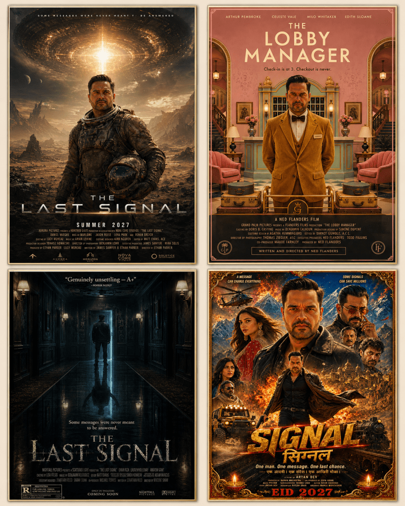 I created a movie poster for a sci-fi epic called “THE LAST SIGNAL” (tagline: “Some messages were never meant to be answered”), then asked ChatGPT to reimagine the exact same film across four completely different genres. The sci-fi original. A pastel-drenched symmetrical hotel comedy (“THE LOBBY MANAGER,” tagline: “Check-in is at 3. Checkout is never.”). A psychological horror version with the same title but a creepy hotel corridor. And a full Bollywood blockbuster, complete with Hindi script, explosions, mountains, and a 2027 release date.