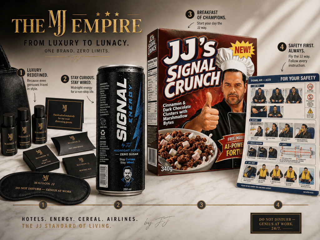 What started as “make me a cereal box” escalated into a full fictional brand universe. Because once you see JJ’s Signal Crunch (“Cinnamon & Dark Chocolate Clusters with Marshmallow Bytes”) looking genuinely real on a kitchen counter, you can’t stop.