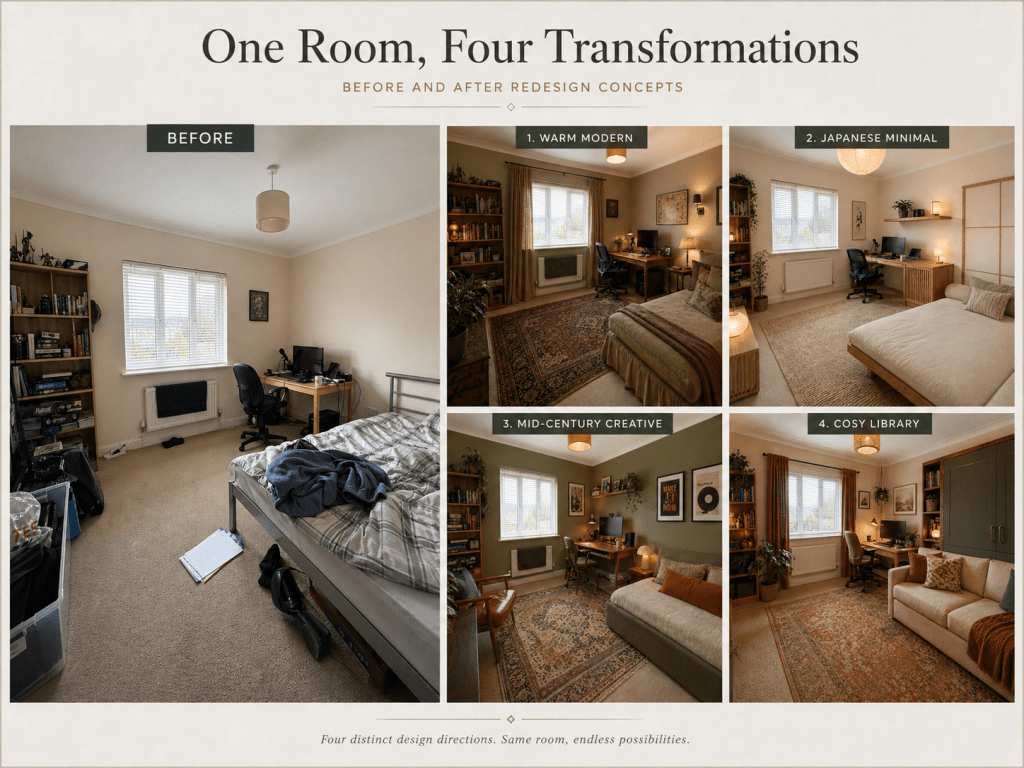 Tip: The more specific and personal your constraints, the better the results. “Make it look nice” gives you generic output. “I need a room that works for video calls, has space for a pull-out guest bed, and makes me feel like a competent adult when I walk in at 7am” gives you something you’d actually want to live in.
