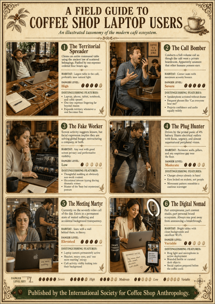 It identified six species: The Territorial Spreader (one espresso, six-person table, four hours), The Call Bomber (speakerphone, no shame), The Fake Worker (screen shows Netflix, expression suggests solving world hunger), The Plug Hunter (4% battery, supernatural peripheral vision), The Meeting Martyr (seventh video call, cafe activity leaking into background), and The Digital Nomad (ring light deployed, Instagram caption already drafted).