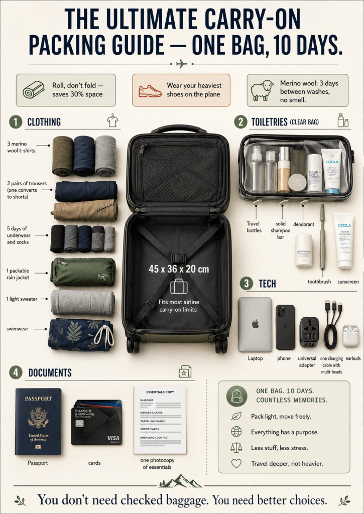 Then I asked for something genuinely useful: The Ultimate Carry-On Packing Guide. One Bag, 10 Days. A clean, beautiful flat-lay infographic showing exactly how to fit everything you need into a 45x36x20cm carry-on. Merino wool t-shirts (3 days between washes, no smell), a packable rain jacket, convertible trousers, one charging cable with multi-heads, and a solid shampoo bar.