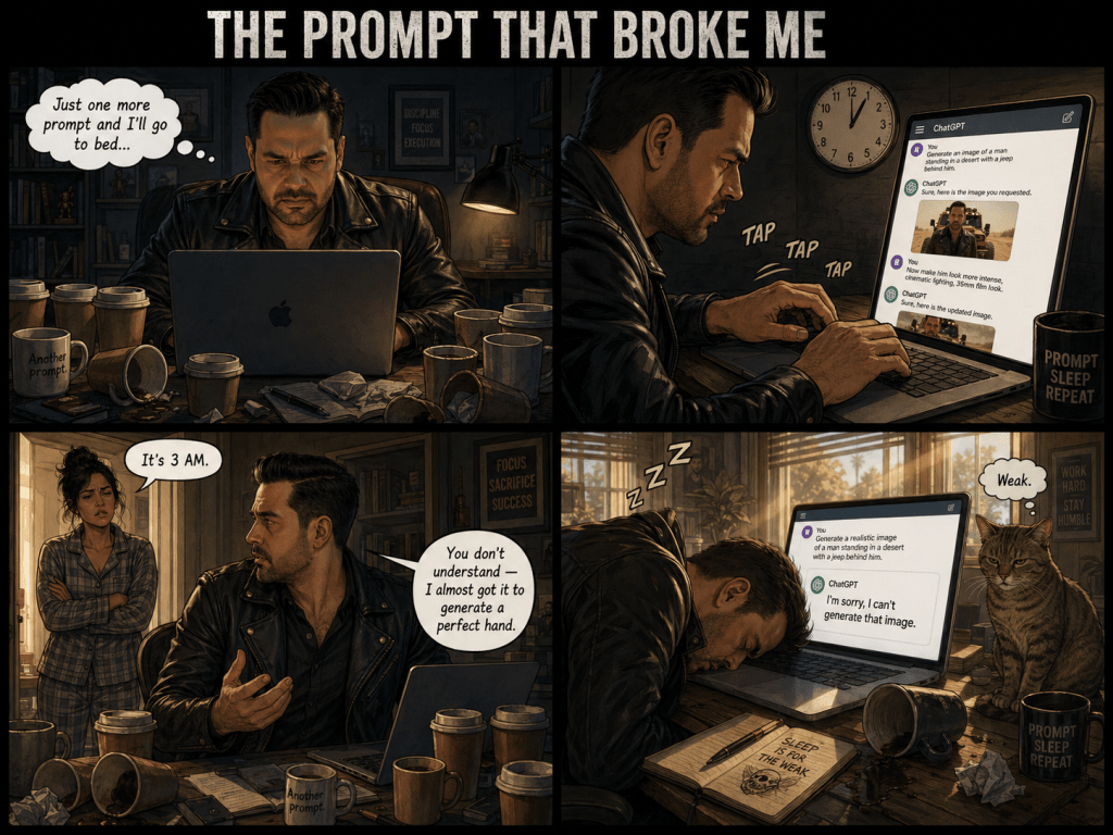 I went with the latter. “THE PROMPT THAT BROKE ME” — a four-panel comic about the inevitable spiral of late-night AI image generation. Panel 1: “Just one more prompt and I’ll go to bed…” Panel 2: Intense typing, clock showing 1am, a mug reading “PROMPT SLEEP REPEAT.” Panel 3: Partner appears in the doorway. “It’s 3 AM.” “You don’t understand — I almost got it to generate a perfect hand.” Panel 4: Asleep on the keyboard. Screen reads “I’m sorry, I can’t generate that image.” The cat judges silently.