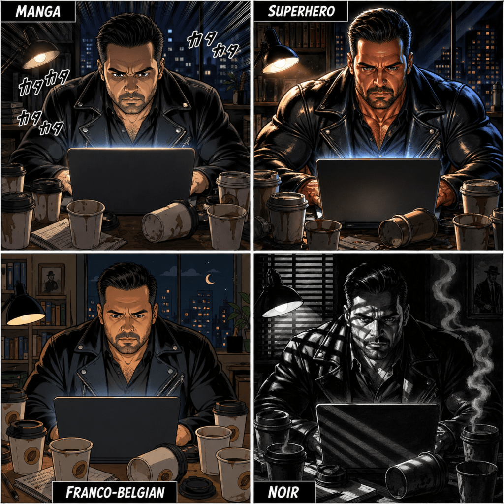 Then I tested style range by rendering the same scene across four comic art styles: Manga (complete with Japanese onomatopoeia for keyboard tapping), Marvel/DC Superhero (somehow I look like I could bench-press the laptop), Franco-Belgian (clean Tintin-style linework), and Noir/Sin City (high-contrast black and white, coffee steam replacing cigarette smoke).